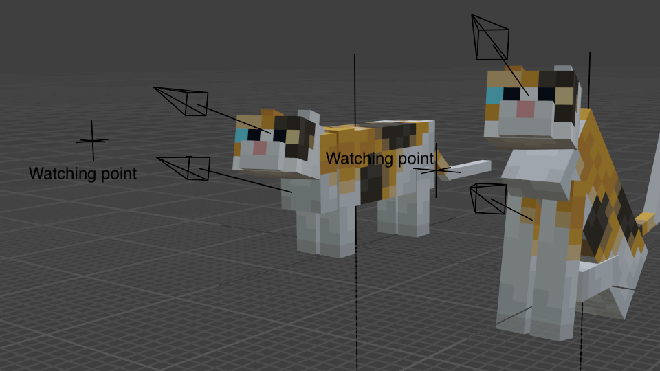 I took Blender and created a sitting and a standing calico-type cat (texture is mirrored somehow). When cats are idle, the cats look straight forward, not looking at any point: