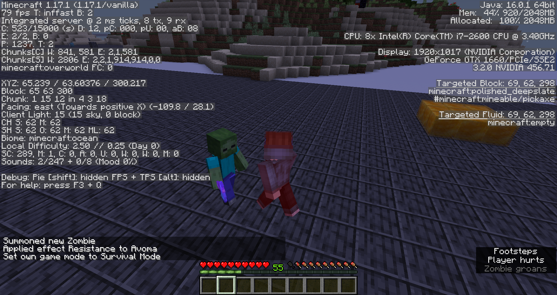 /summon zombie ~ ~ ~ {HandItems:[{id:"diamond_axe",Count:1,tag:{Enchantments:[{id:"sharpness",lvl:2147483647}]}},{}]}/summon zombie ~ ~ ~ {HandItems:[{id:"diamond_axe",Count:1,tag:{Enchantments:[{id:"sharpness",lvl:2147483647}]}},{}]}Give yourself resistance