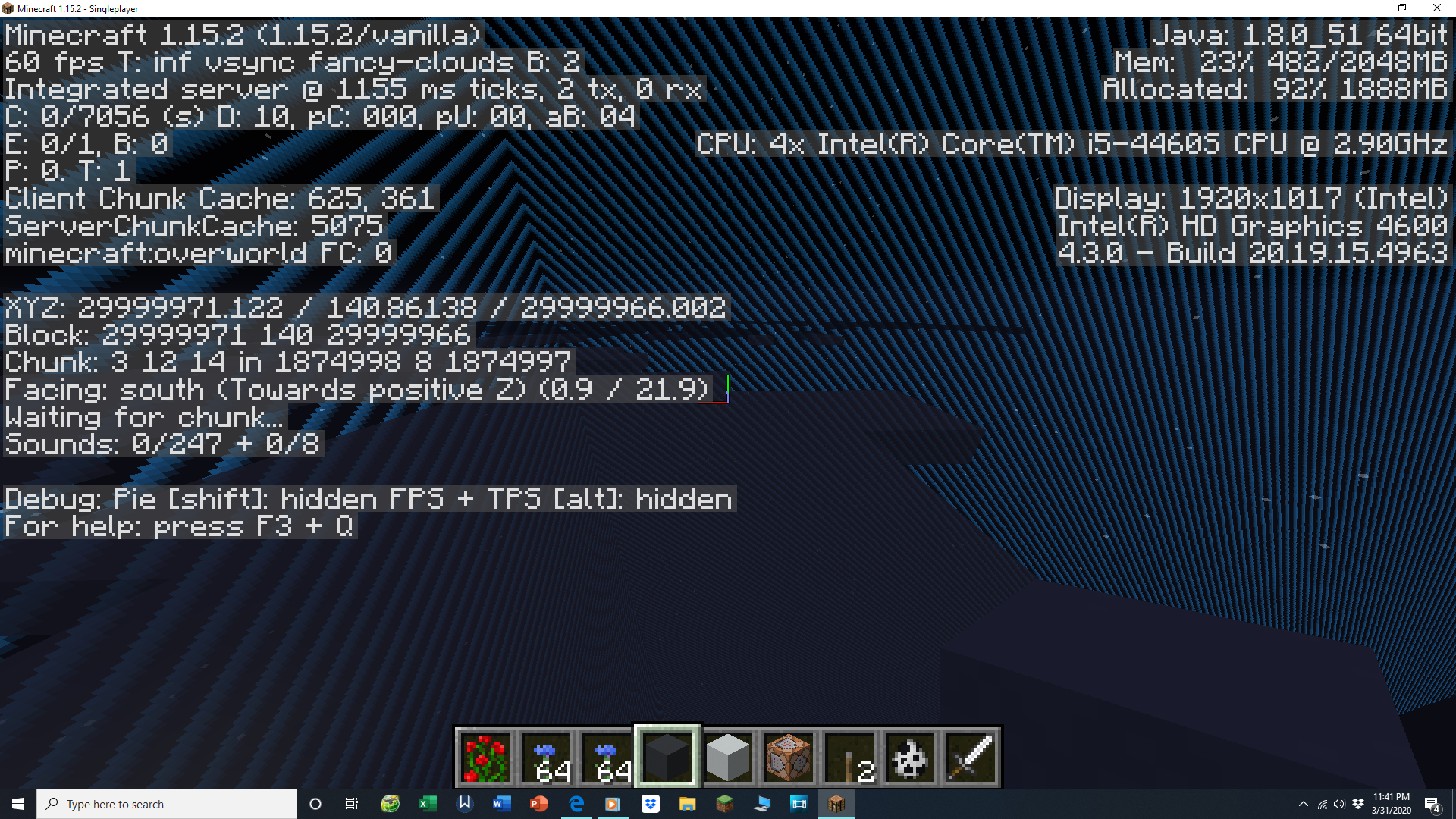 Oops, sorry. Wrong coordinates. I teleported to 300000000 0 300000000 when this all happened