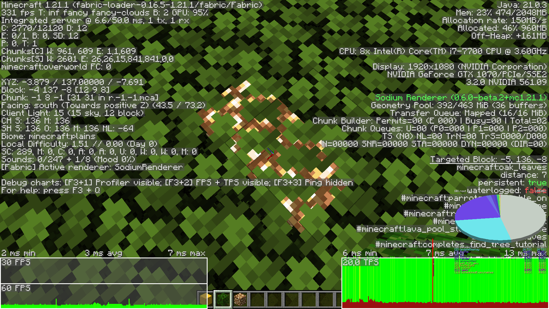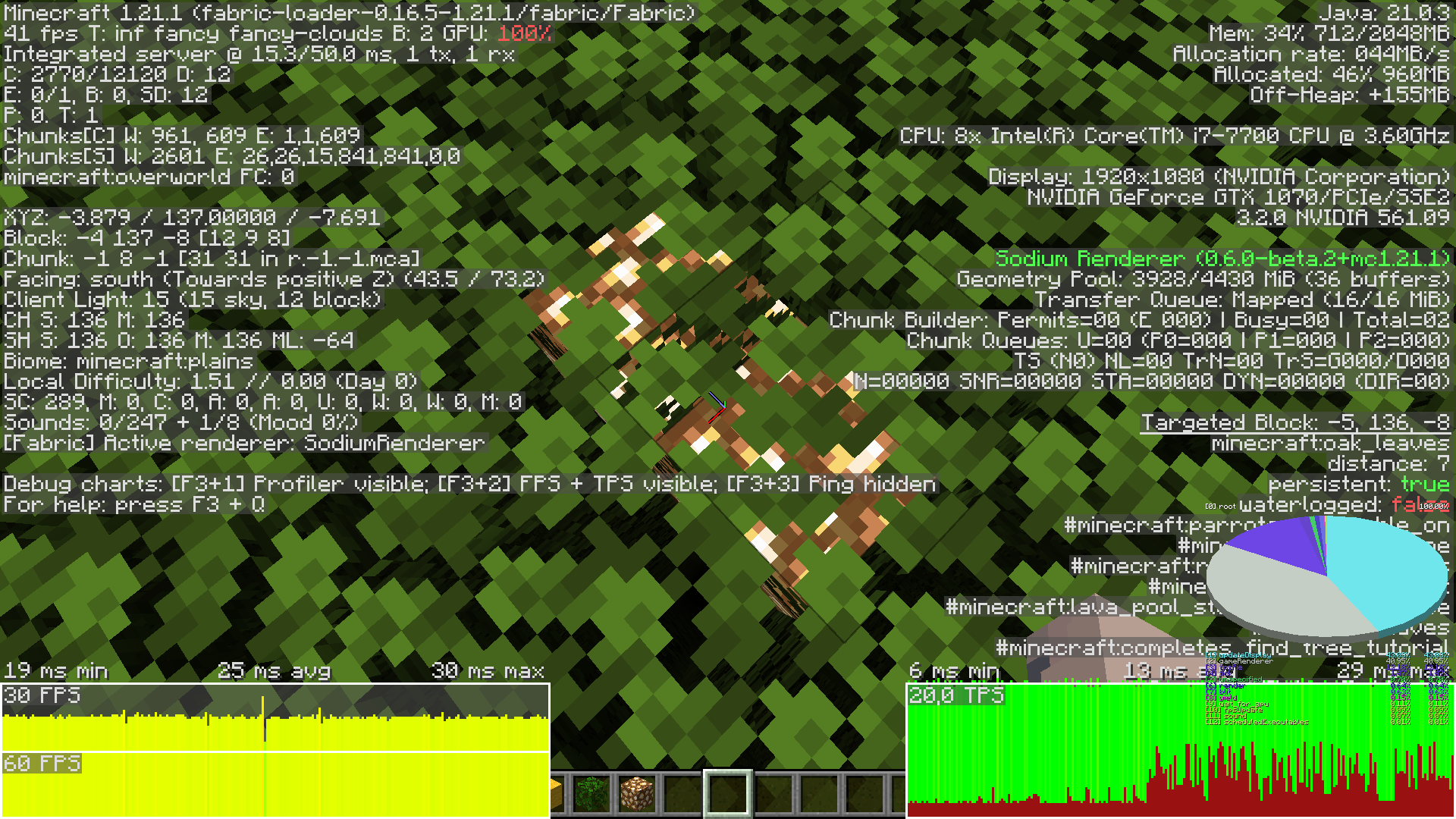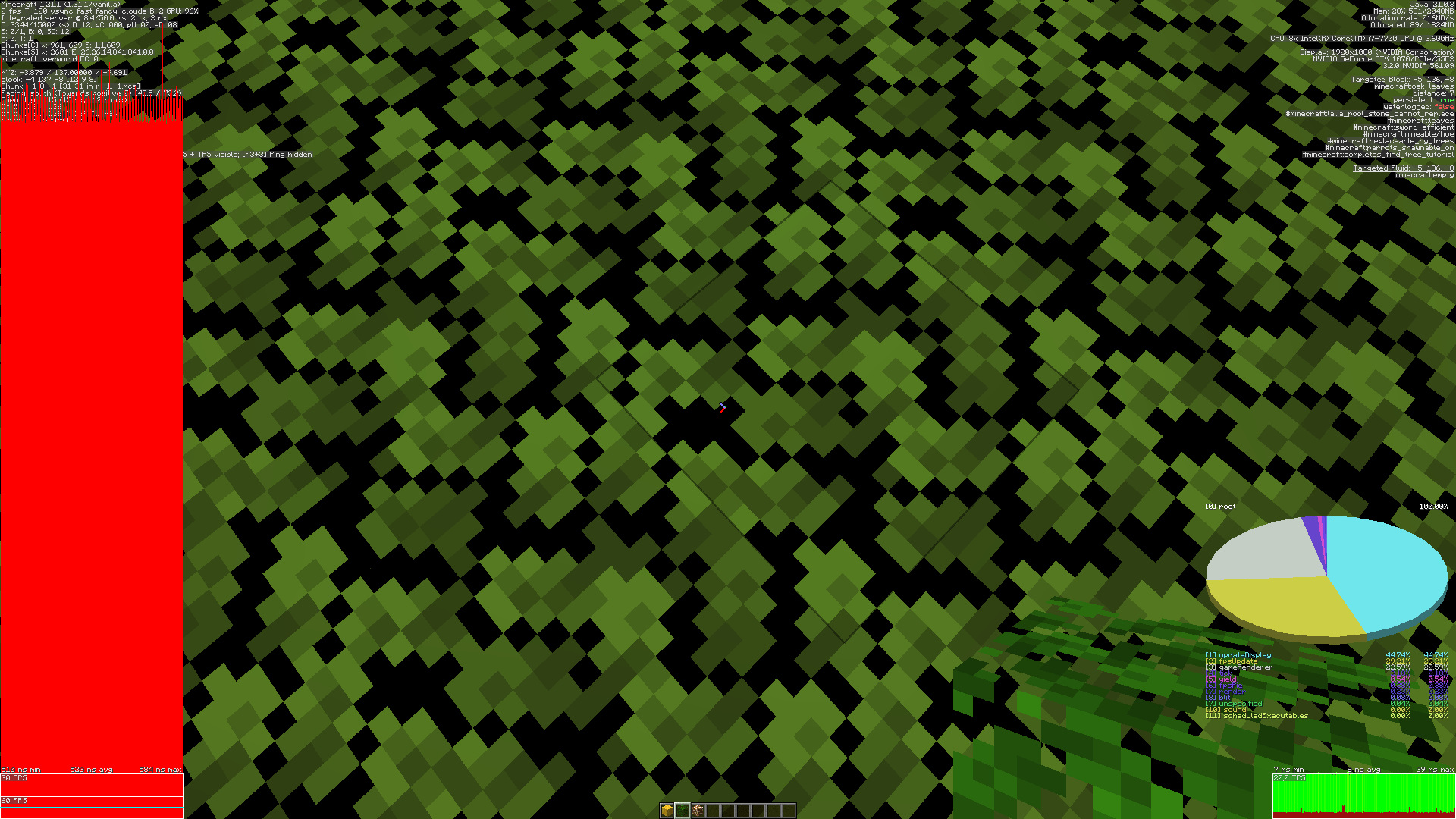Opaque leaf blocks are not culled, dropping FPS in forest areas.