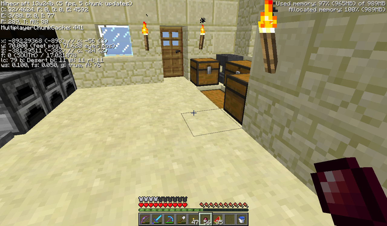 Today i started my game in 13w24b, went in my creative world to check out the new golden apple effect. then i save and exited and went in to my survival world (it was also first in the menu screen not my creative world that i last loaded) and had a massive fps drop (i was getting 0-4 fps) i pressed f3 and my allocated memory was at 100% and my used at 97% i pressed escape and crashed. next i reload minecraft and went in to my survival and it was working good (35-50 fps) i was to recreate the crash, so i backed out and went in to my creative world then waited a good 30 seconds and then went back in to my survival world and had the same thing happen and took a screen shot. grated my computer isint the best in the world and the creative world is heavily MCEdited with a lot of custom spawners and i always have strength level 126, water breathing 1, Regen 2,resistance 126,fire resistance 1,hast 2,speed 3,and jump boost 3 all for like 99999 seconds if that matters. i have been able to re-create bug this 4 times.