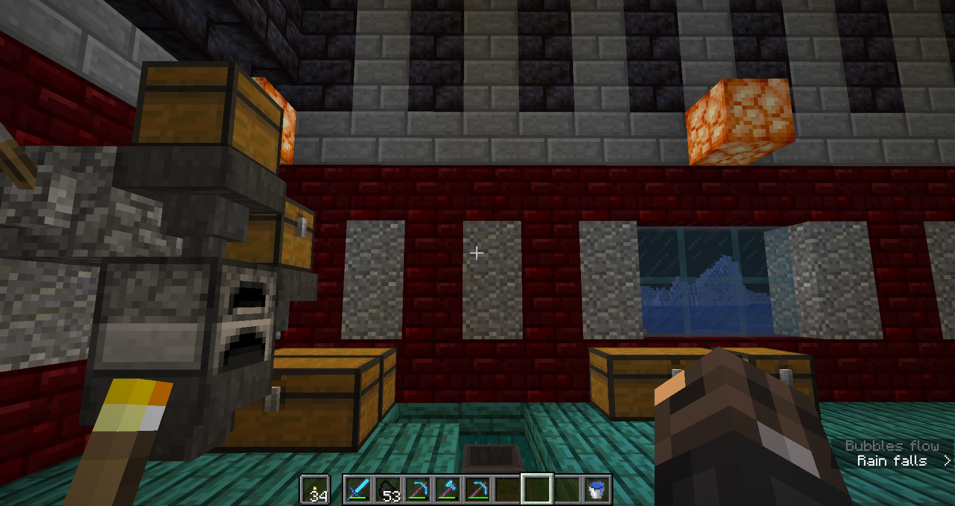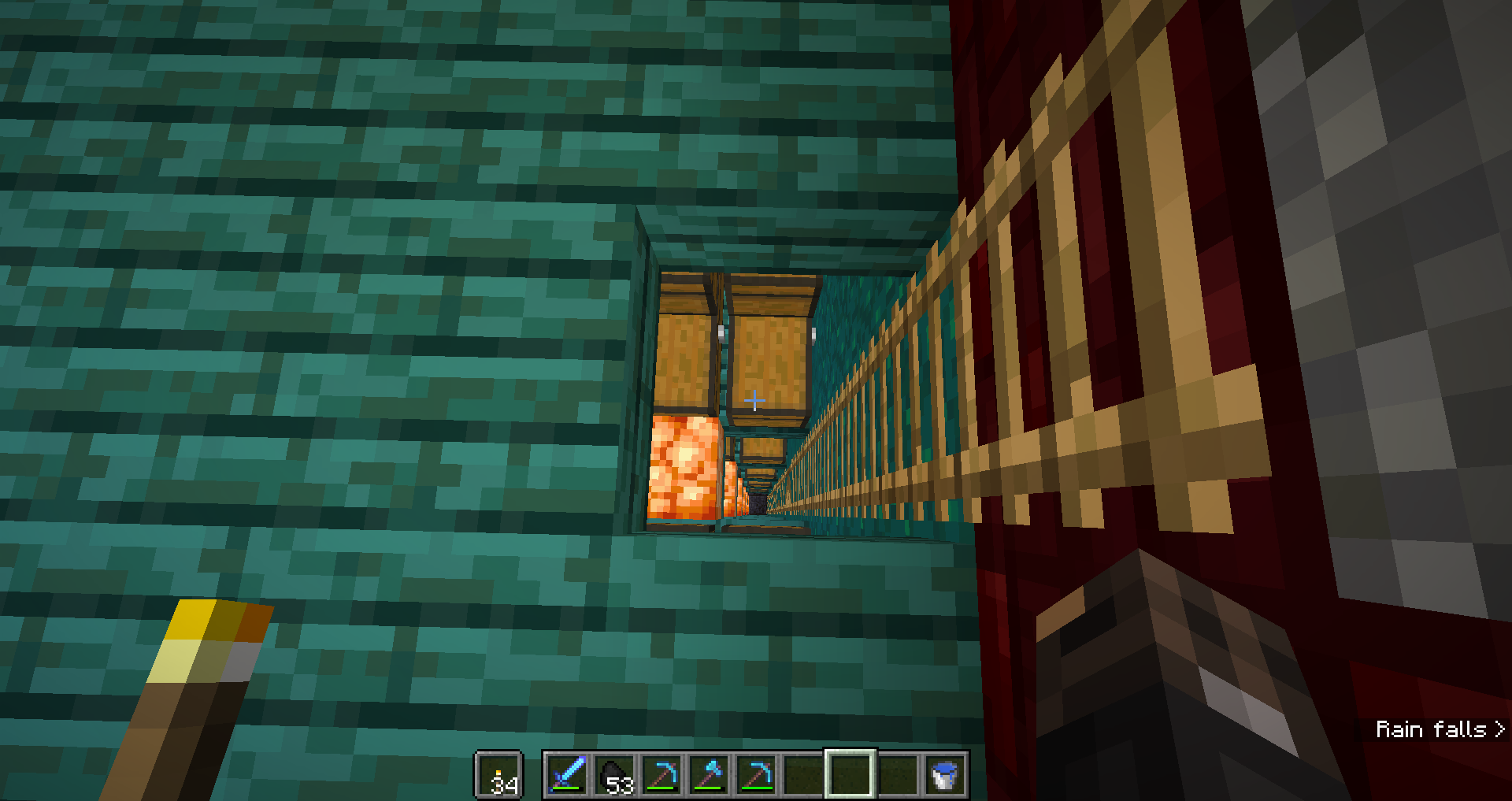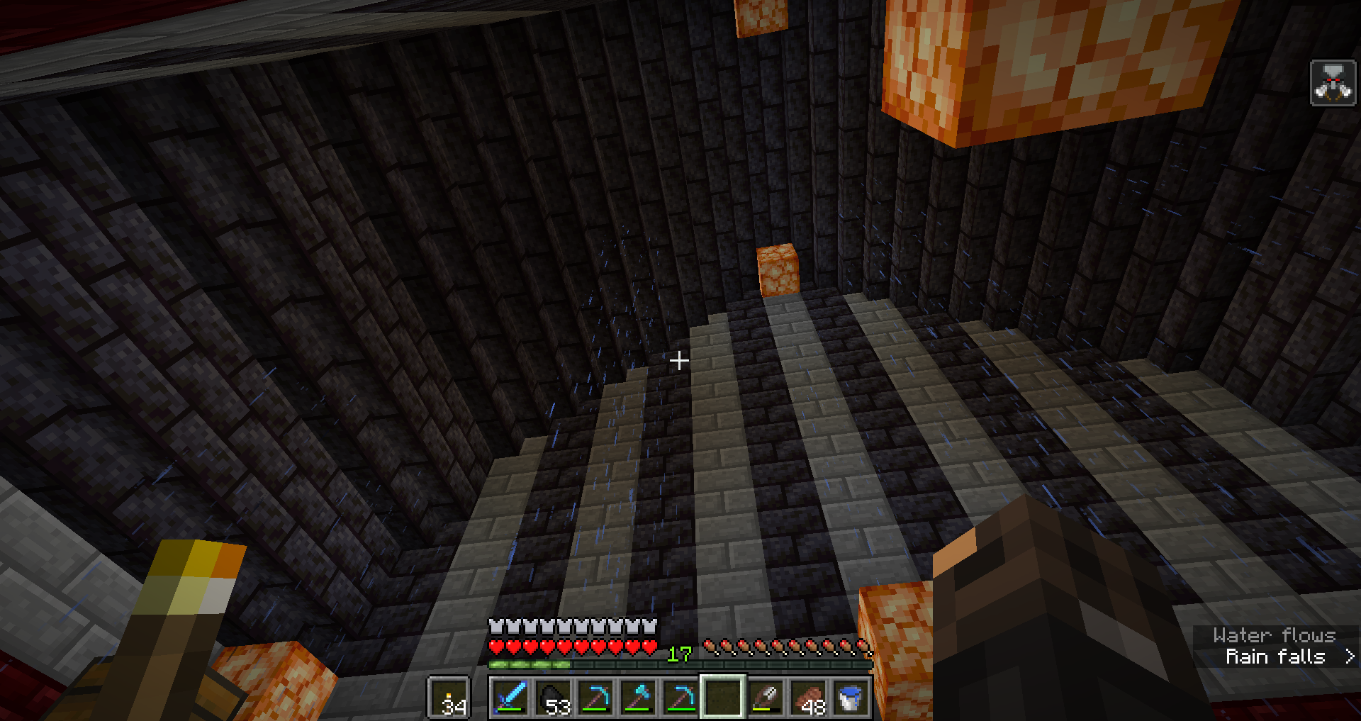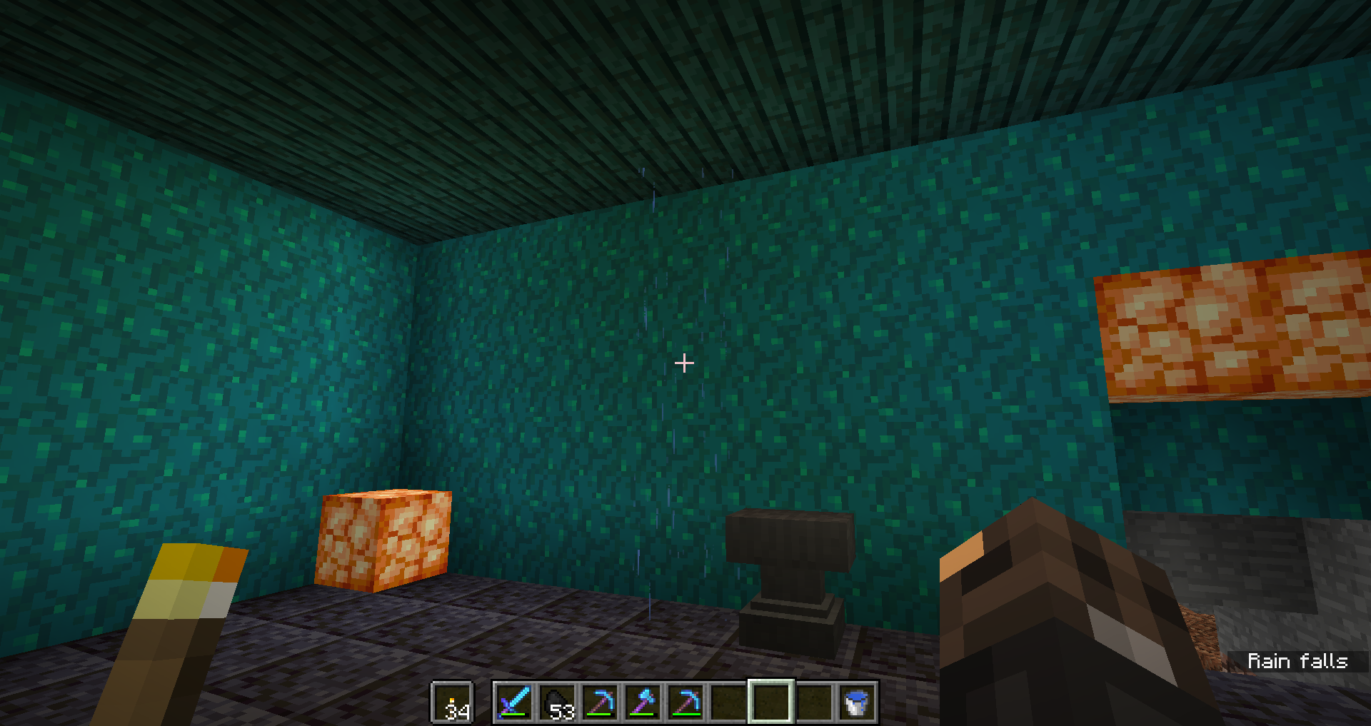 My roof leaks. I went around and patched it, but it keeps coming back when a different type of storm appears. I could not replicate in a new game but the conversion from 20w16a all blocks that were in place the rain seeps there, and I mean all the way through walls with more than 10 blocks high. I don't know any particular block that causes as I have seen it go through Stone Brick, Black Stone Brick, Red Nether Brick and even the Mushroom light, so I don't think it is block related, but is something in the Rain algorithm.