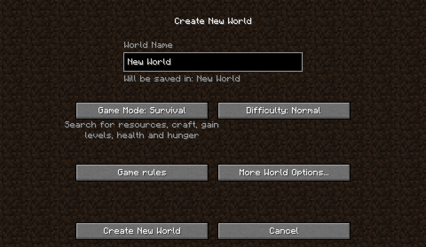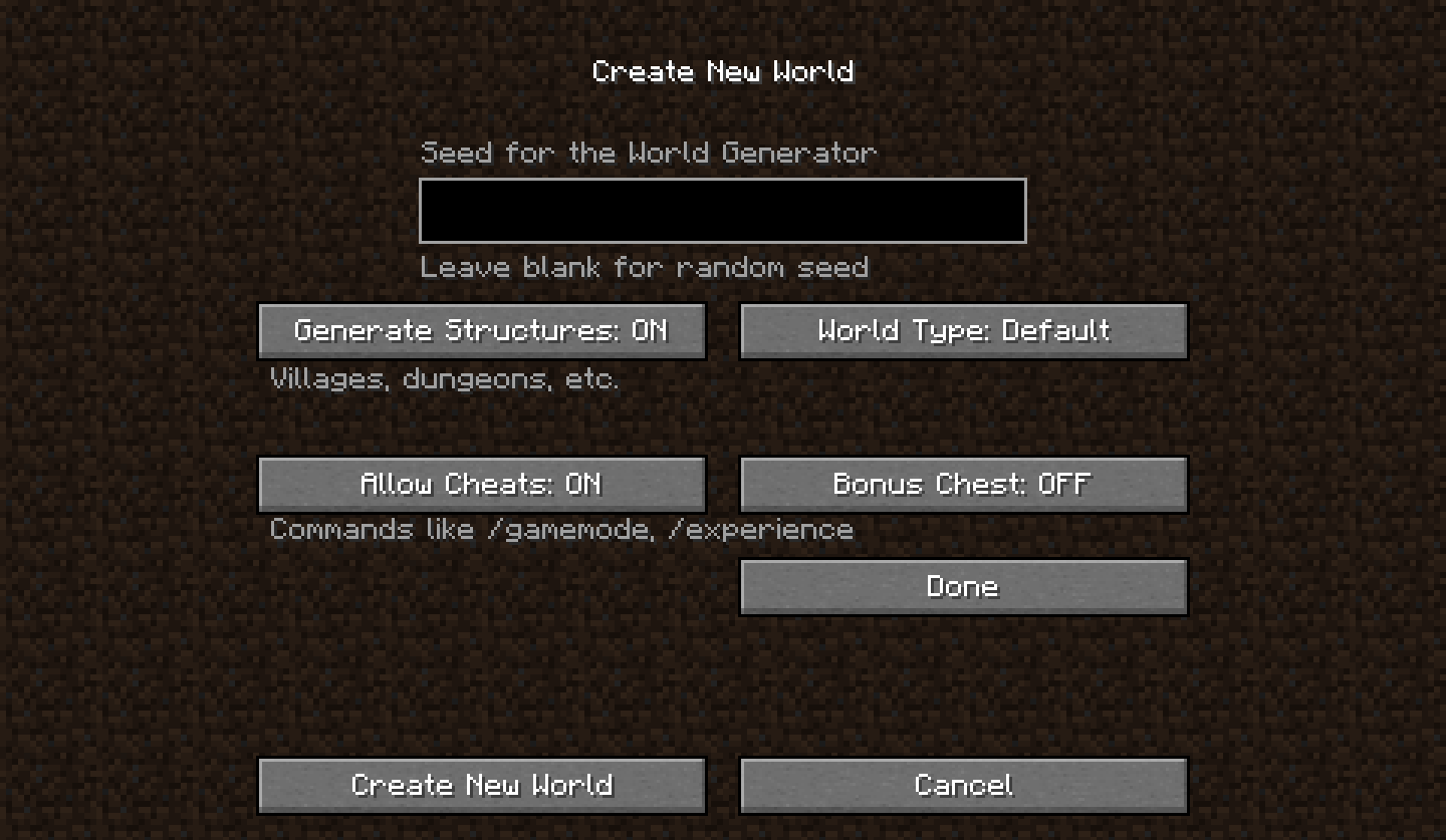The description for "Game Mode" flows outside of its alignment and the commands description for "Allow Cheats" flows into the Bonus Chest area. This isnt new, but with the new menu layout the element labels now flow into the other options, making the menu a bit confusing. Additionally, the buttons have non-intuitive positioning, so the menu misses a sense of heirarchy: the "Done" button on the More World Options screen is not in a central position and the options on the main screen are evenly spaced making the Create and Cancel buttons less obvious (something more like the first 4 on the more world options creen would be better.
