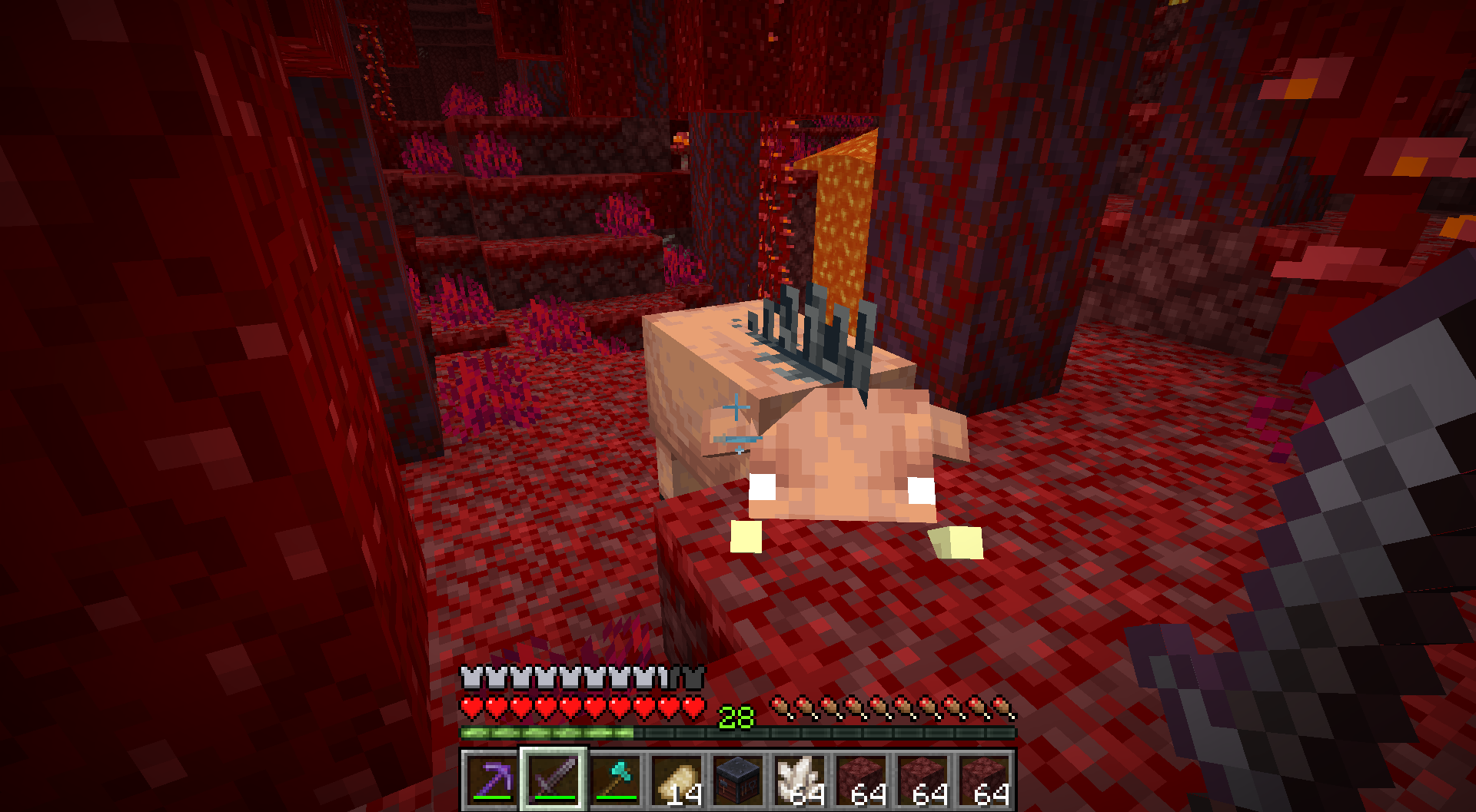 When Hoglins try to attack a player, sometimes they will not try to jump up and just try to attack from there. When they are in this state, sometimes hitting them with a sword will simply not damage them and it can take several tries. In the attachment, you can see a Hoglin that just stays at the block.