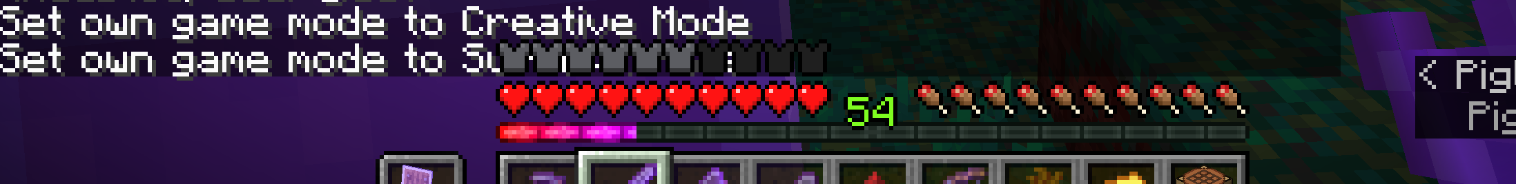 I was in my practice world getting ready to take down the Piglin Bastion, and when I had prepared my gear I set my game mode to survival. The chat message rendered behind the armor points