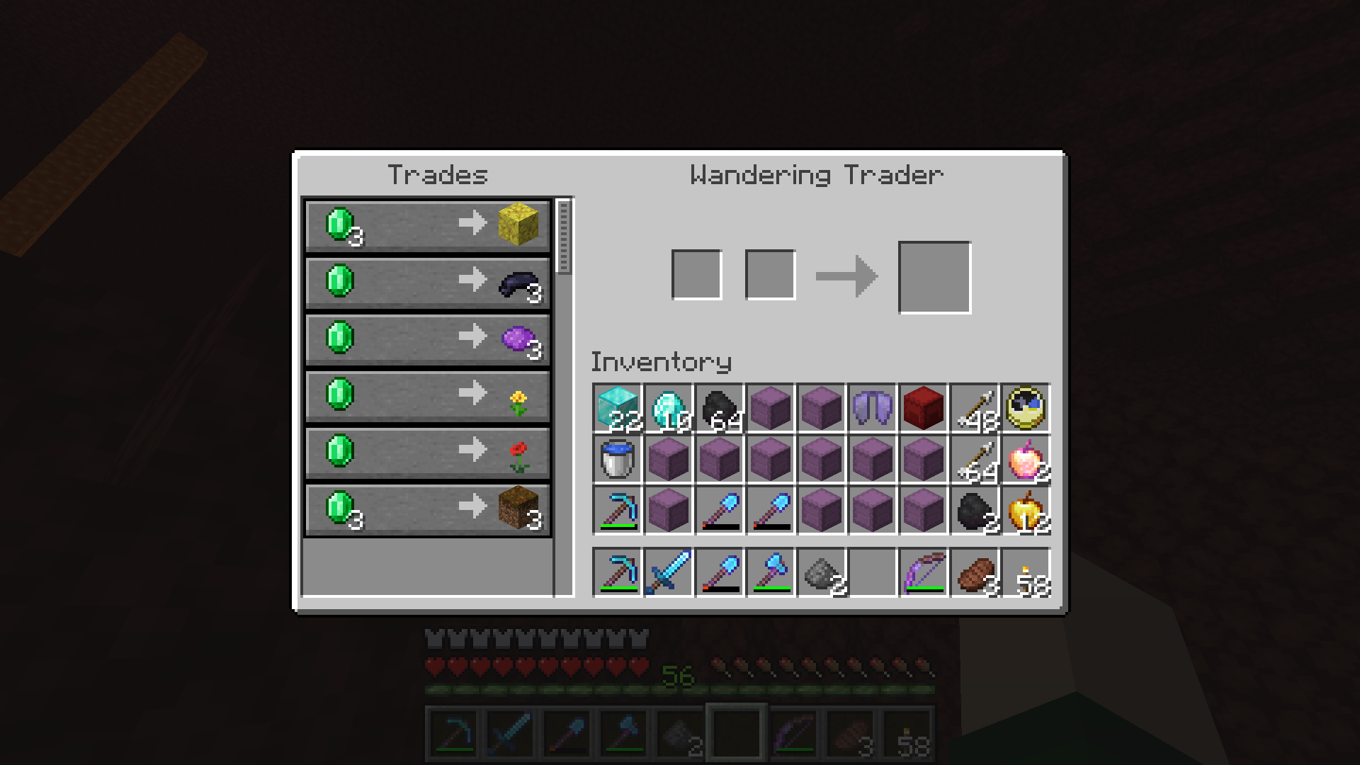 As per title. Heard it first while commuting through the Nether, so I popped into spectator mode to look around. Turns out it's quite tricky to find an invisible Wandering Trader in there, even with spectator mode. While I do have a portal nearby, I can't remember the last time I went through it, so I doubt it wandered through. No Llamas for whatever reason.