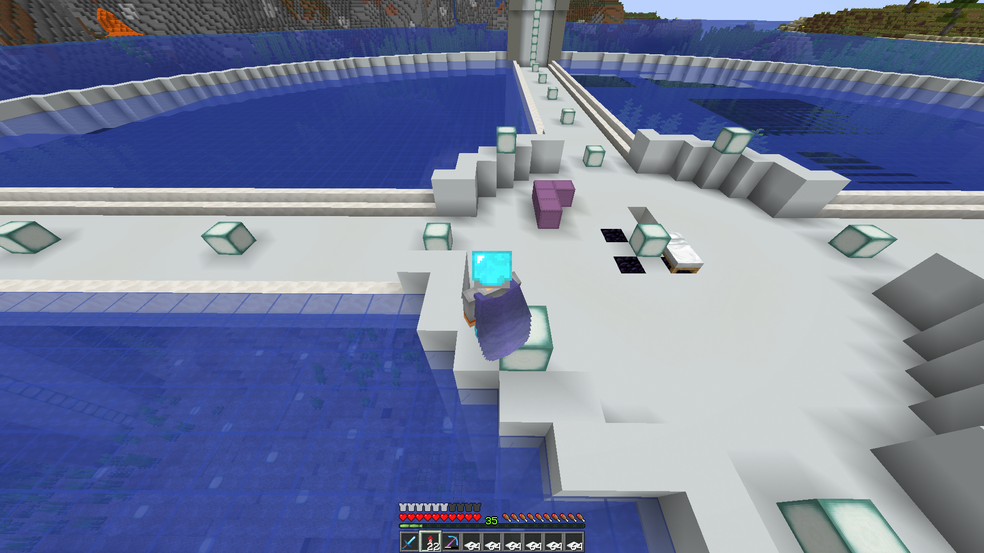 When placing large amounts of blue glass ontop of the oceon i noticed that it caused a visual bug if standing in the right location, the bug disappers when a player comes close to the glass that is being affected by the bug.