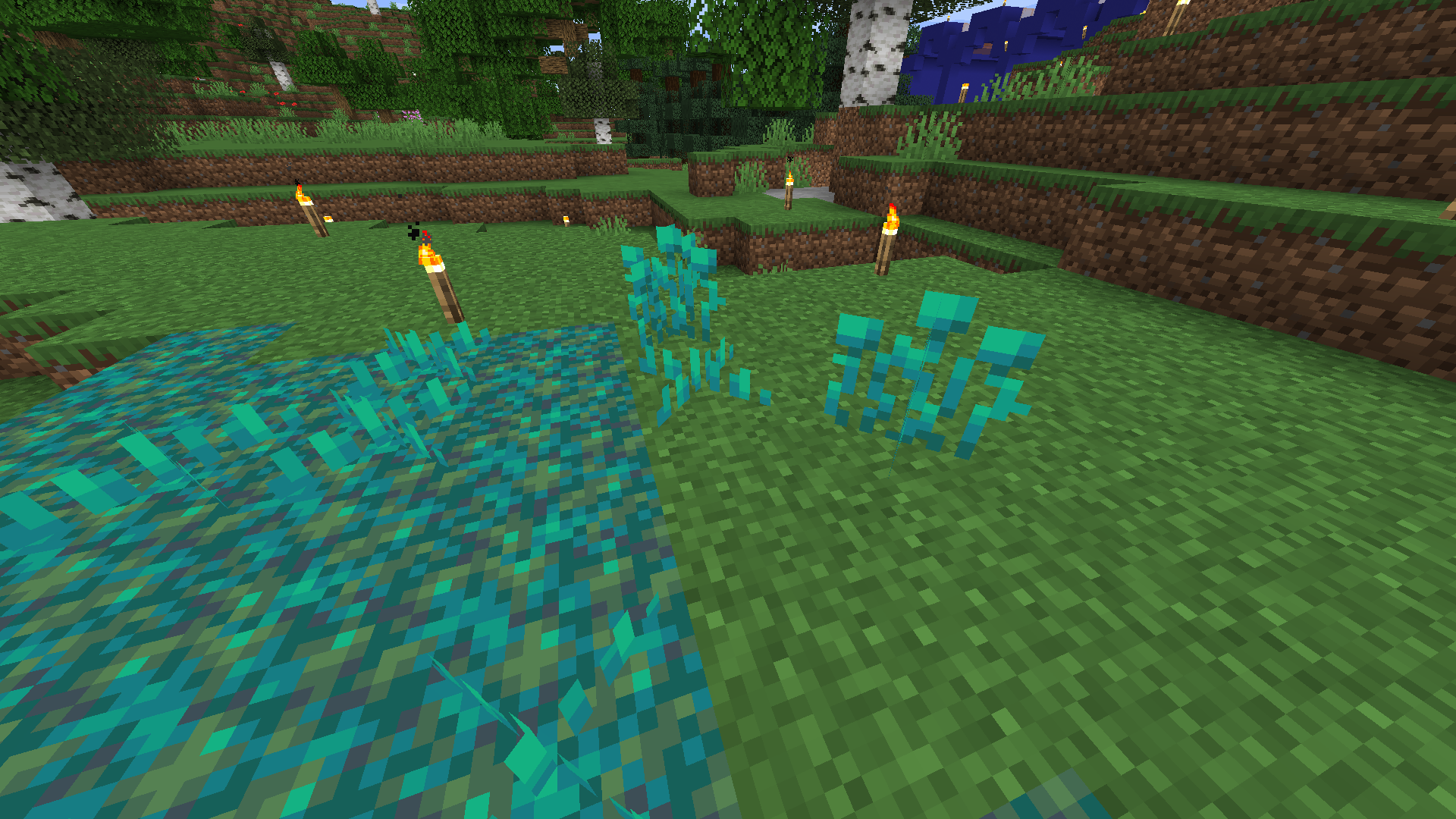 When you use bonemeal on warped or crimson nylium in the overworld, the sprouts and roots can sometimes grow onto grass blocks nearby.