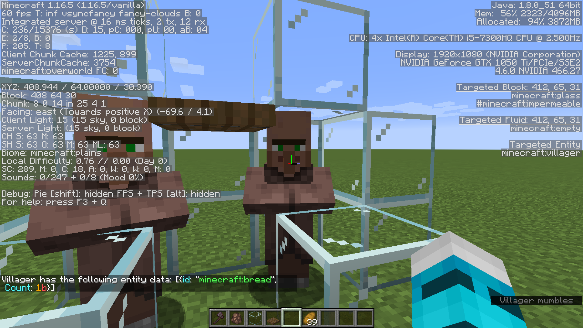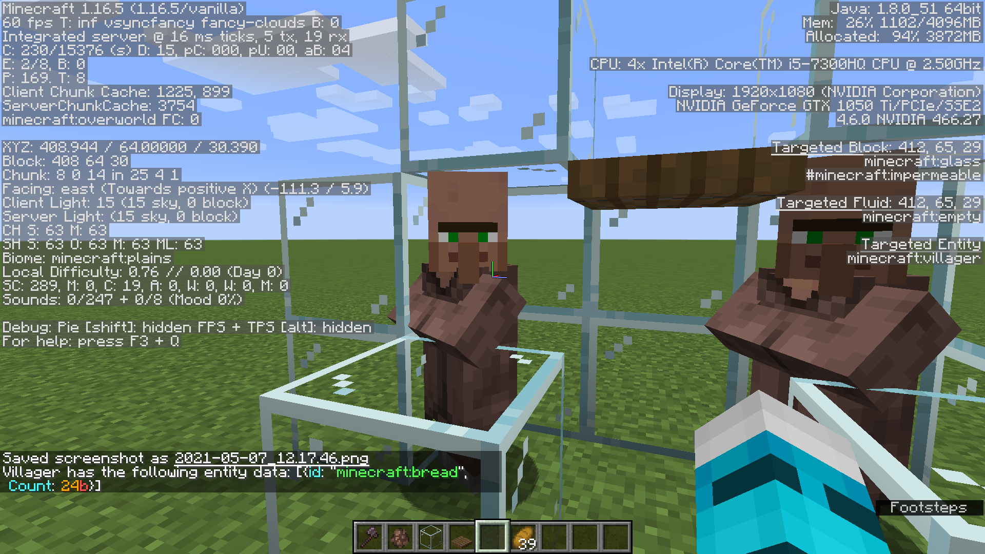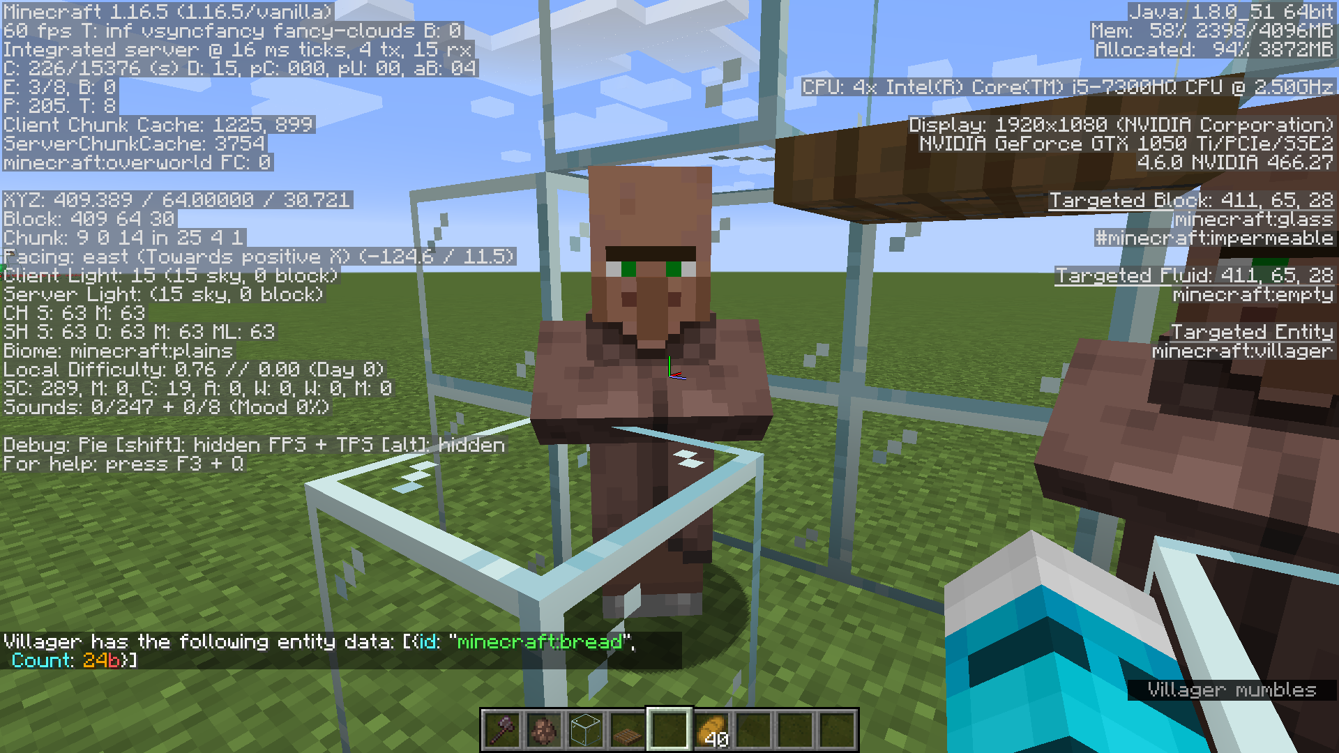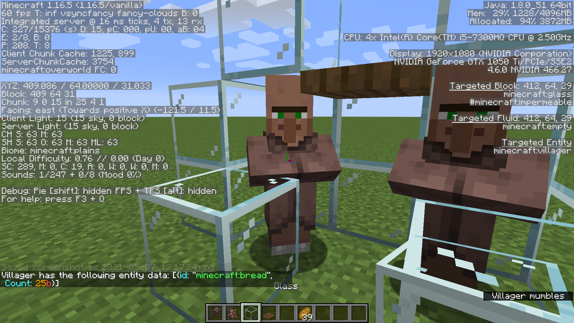 The screenshots shows that the villager on the left have 24 bread in its inventory and wont share any with the villager on the right, but when it recieves a 25th loave of bread, it will share it with the villager to the right.