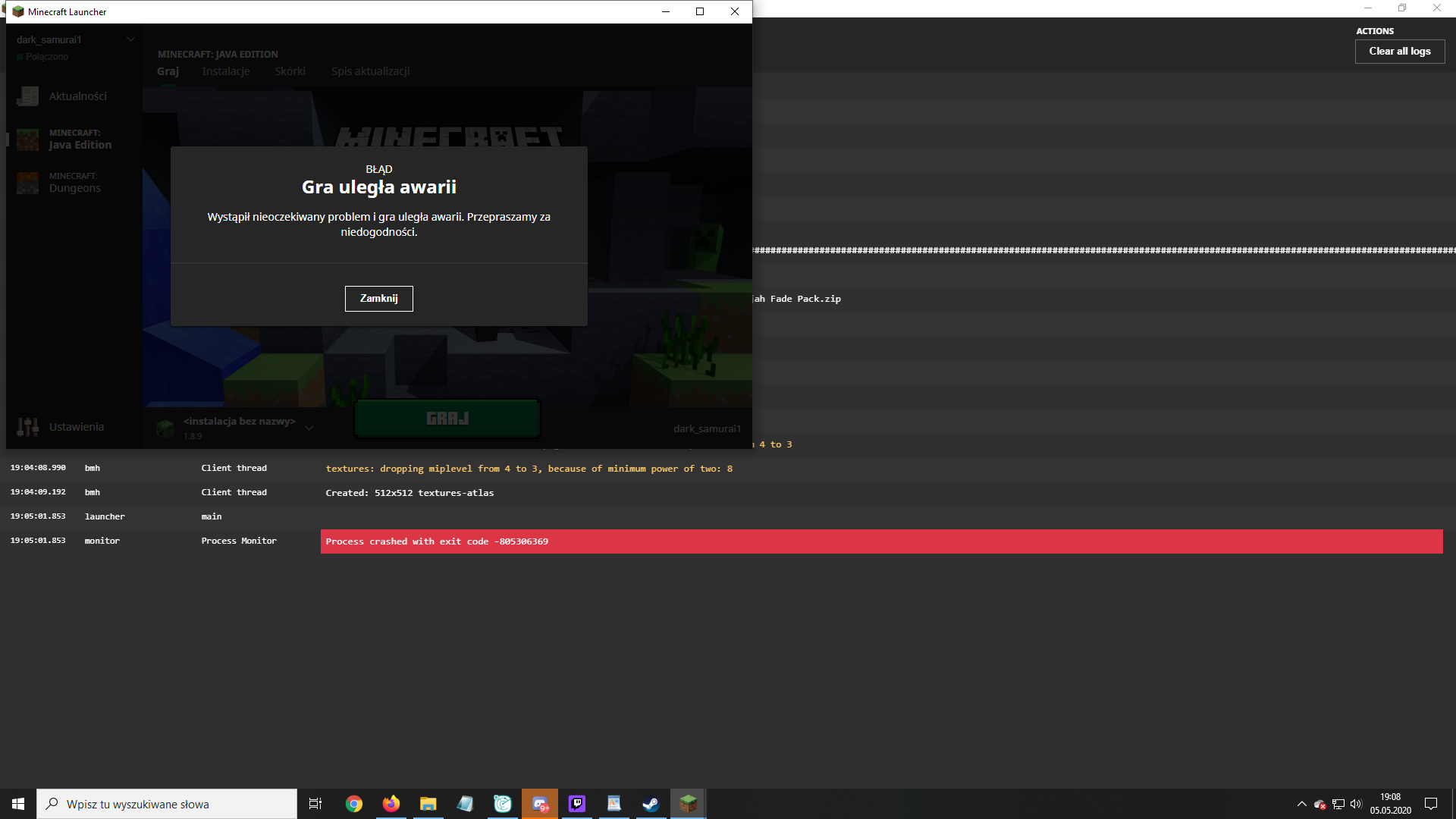 I uninstalled the minecraft and installed it once, but the minecraft still breaks down. ):