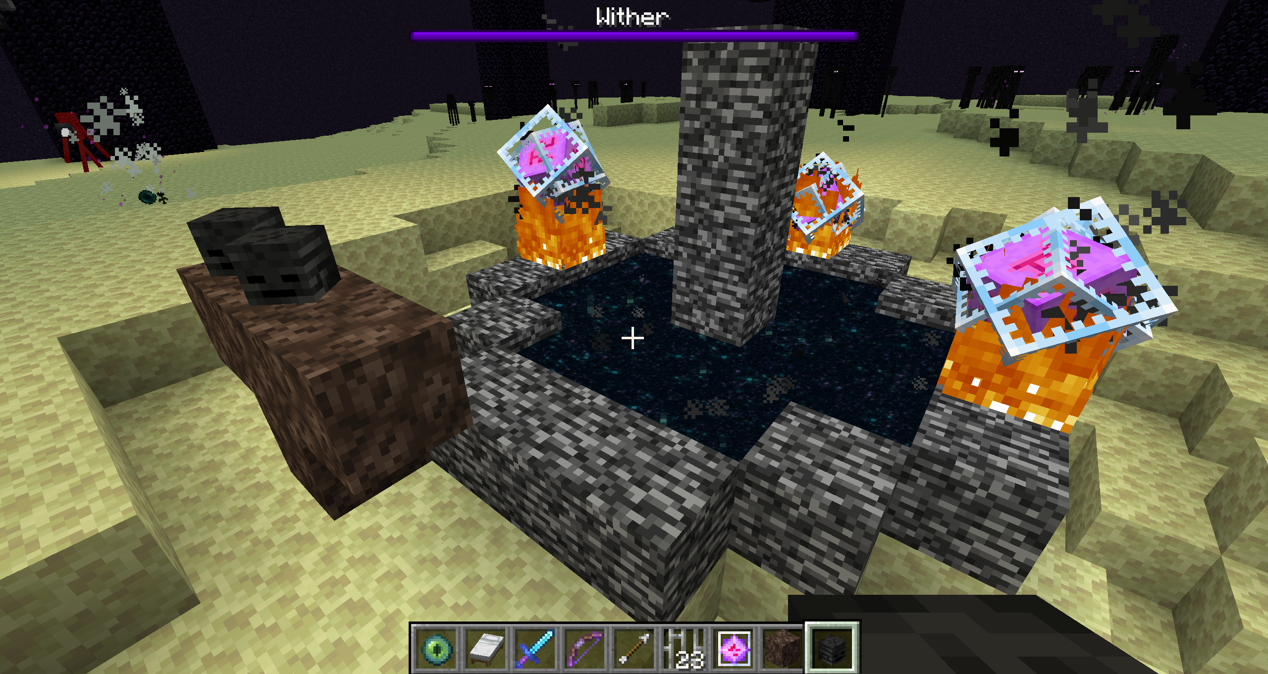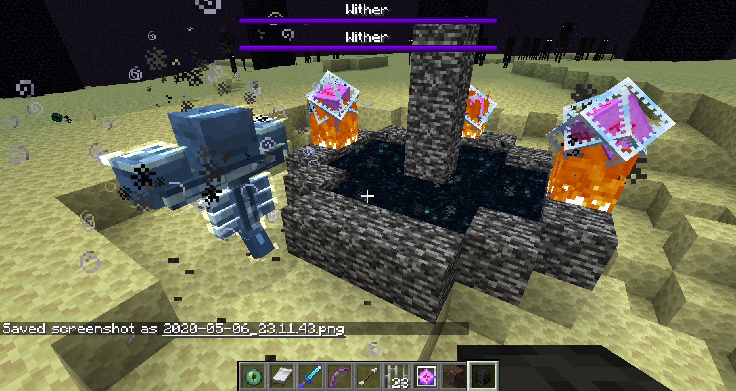 The end portal blocks going back to the Overworld vanish as is intended when placing down the end crystals to respawn the Ender Dragon. However, if the end crystals are blown up by the initial Wither spawning explosion, or a bed, prior to the dragon being successfully spawned in, then the end portal blocks will break.
