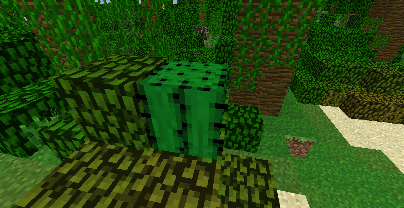 when at where the jungle biome and desert biome meet, i found that a cactus block was growing on tree leafs next to another block.