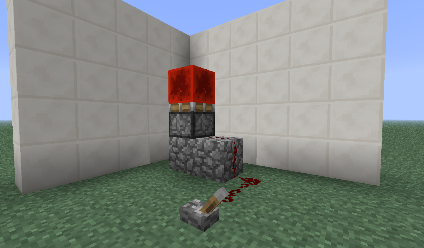 Photo Two: Power is applied. The piston extends and pushes the redstone block up.