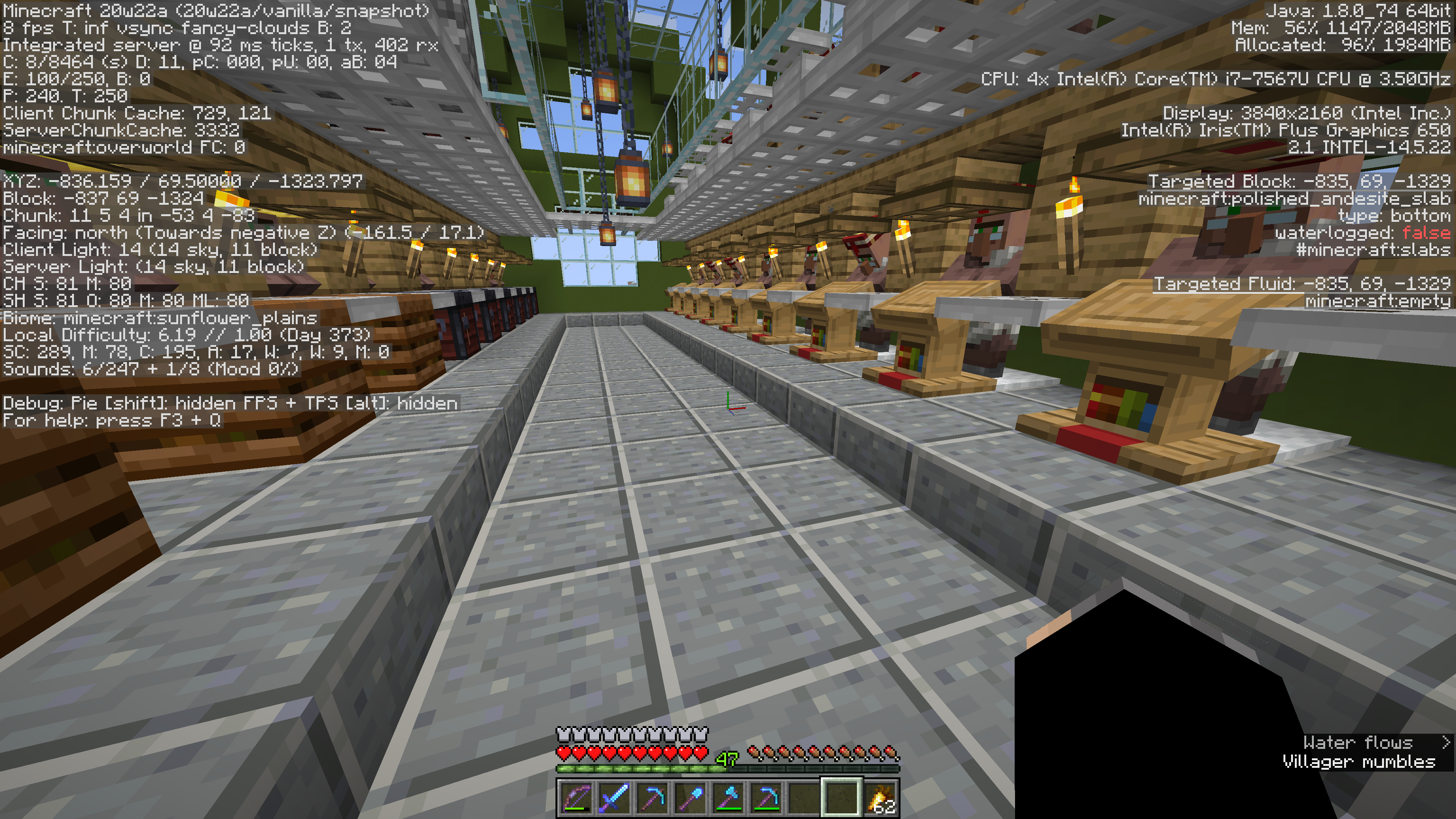I play Minecraft Java Edition in my computer, which has Windows 10 64-bit as OS, an Intel Core i5-8265U as CPU, 8GB RAM and a Intel UHD Graphics 620 as GPU. In snapshot 20w21a the framerate was stable around 30 or 35 fps. In the latest snapshot, 20w22a, the framerate is always around 12 and 21 fps and it lag every while, making the game unplayable. To have a decent framerate, I must set the render distance 2 chunks and minimum graphics. In older snapshots, I used maximum graphics and 16 chunks render distance. I don't use any resource pack