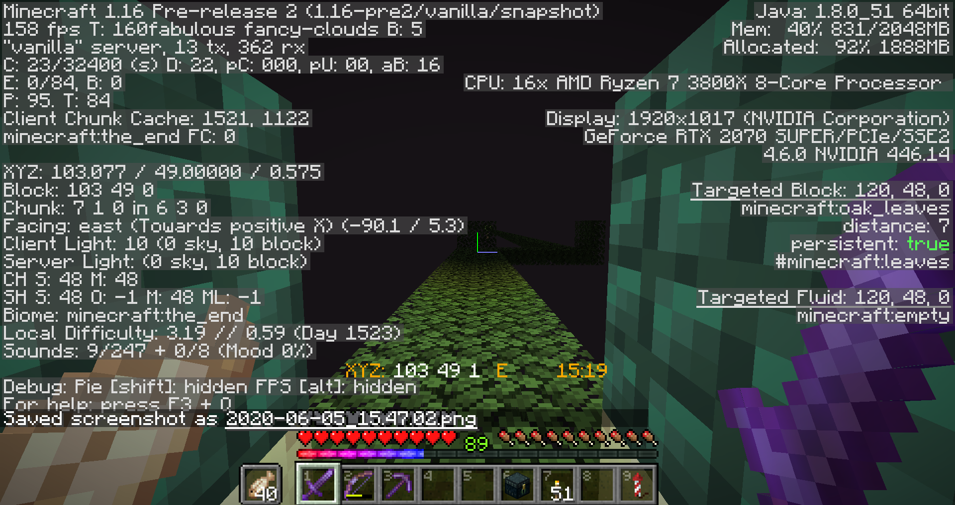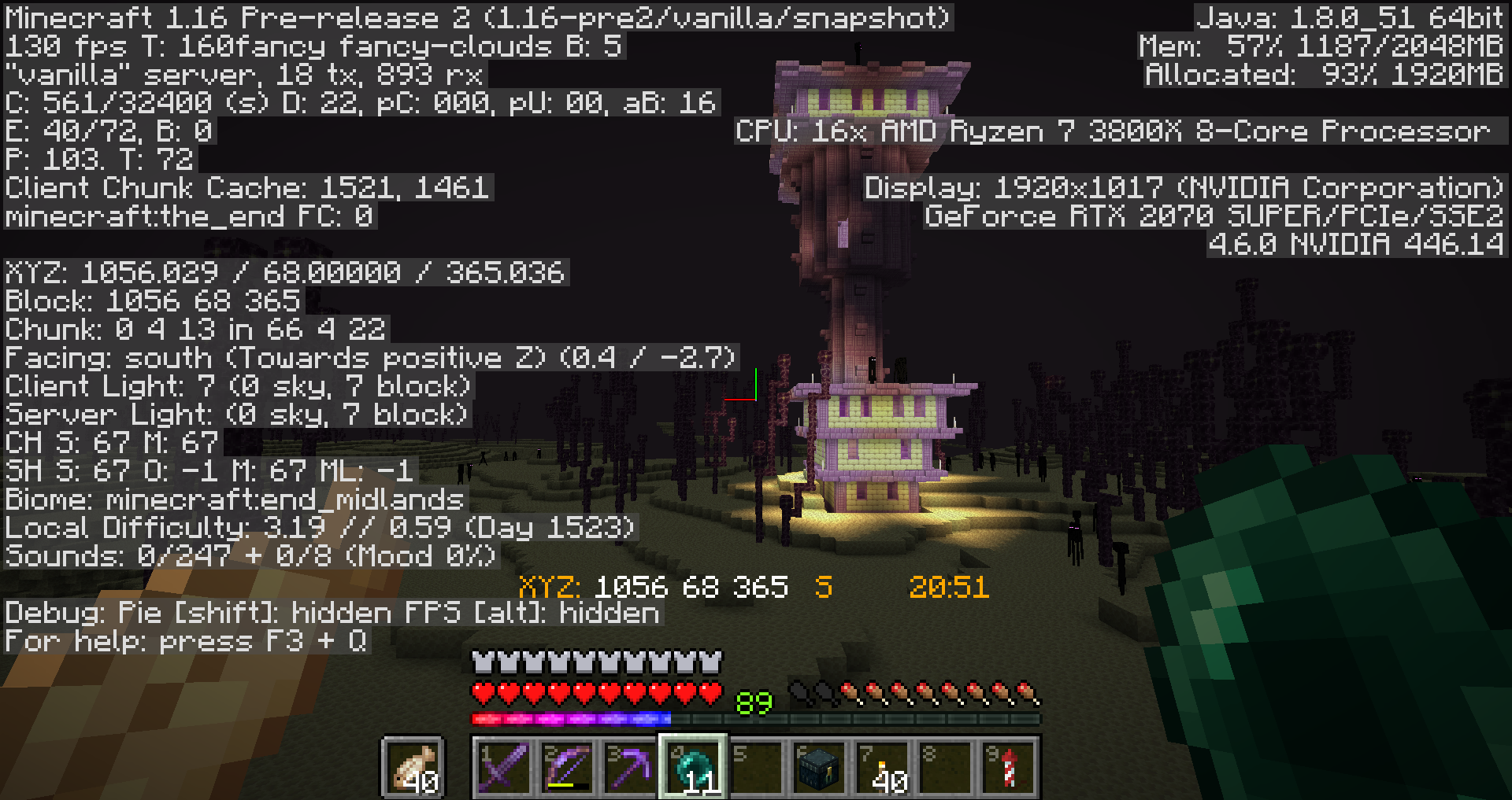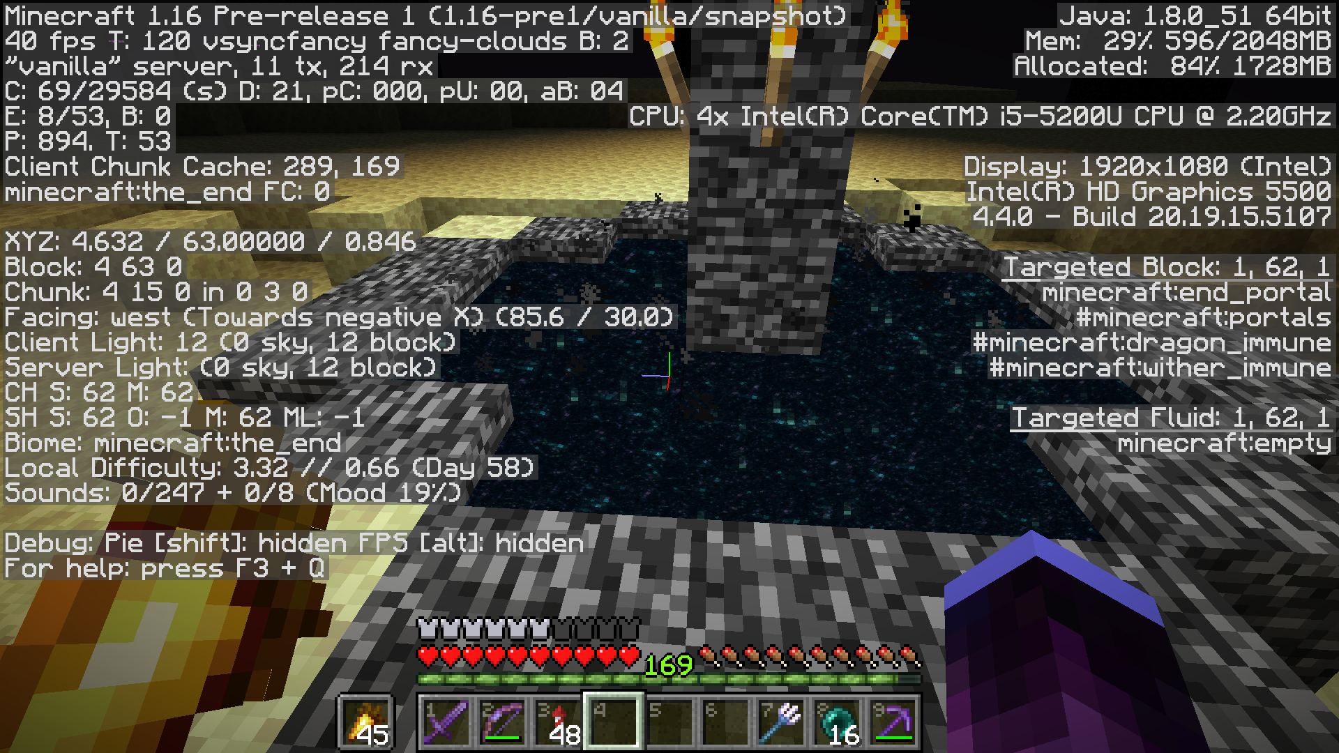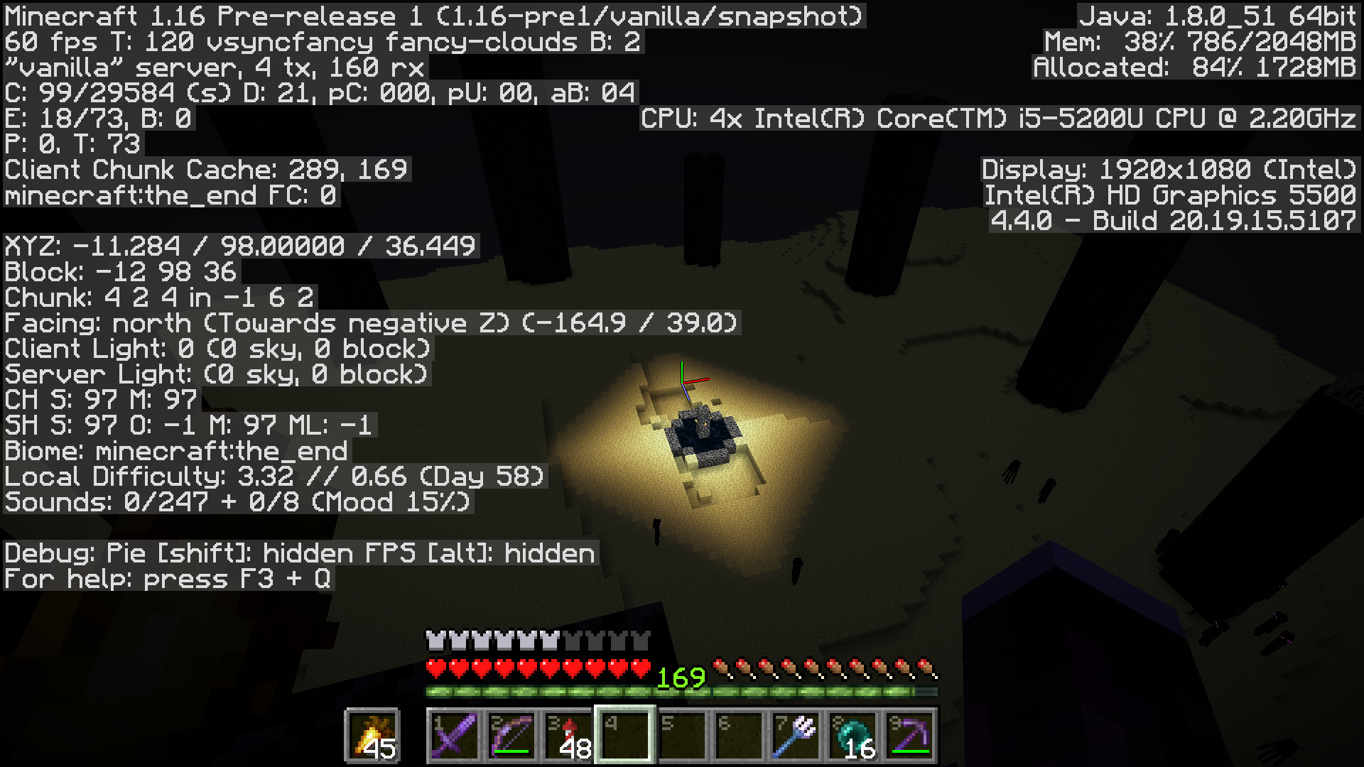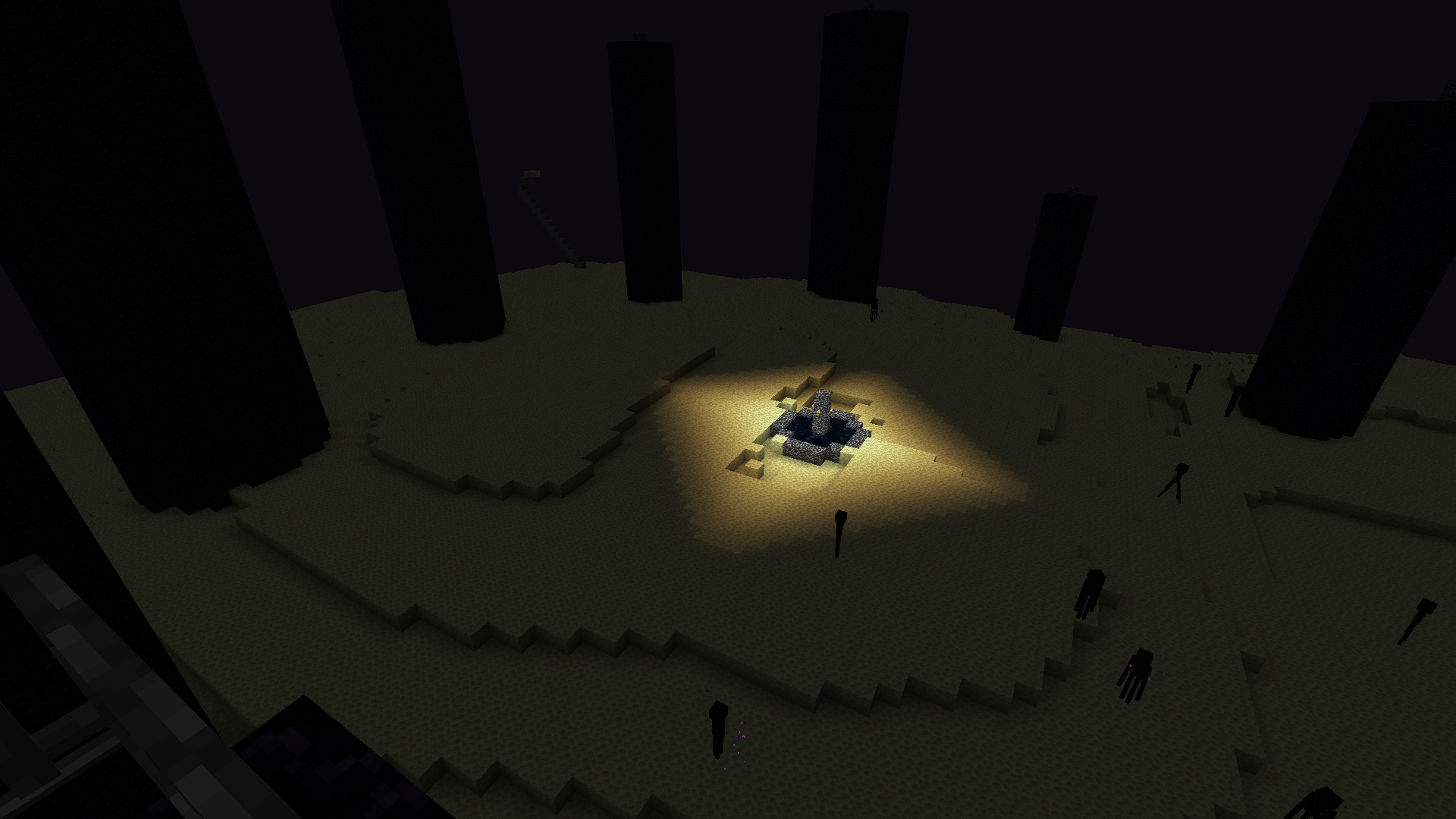 The end dimension appears to be as though it were lit only by the light sources provided by the player. This bug messes with the aesthetics of the end and make it very difficult to see.
