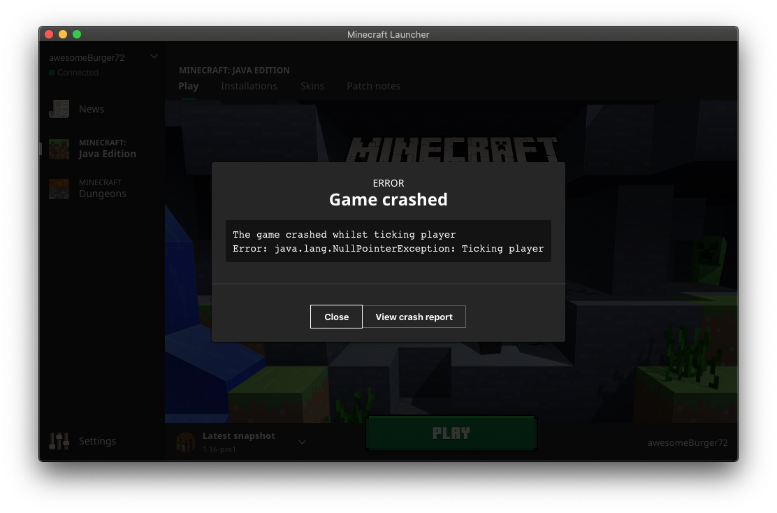 In a creative world in the 1.16 pre-release, the first time I enter a Nether portal in a world, it works perfectly, but once I leave the Nether, and try to re-enter, it crashes and gives me the error: