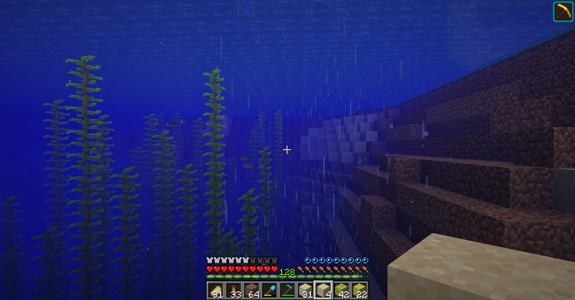 When under blocks, rain particles will still fall through them. When underwater rain particles are still displayed within water.