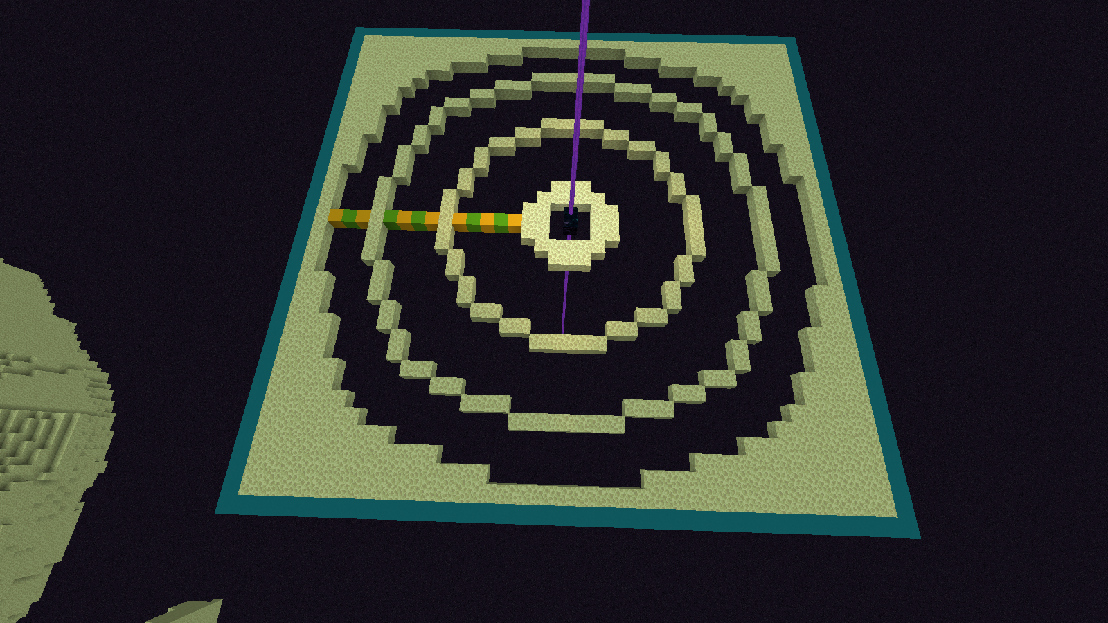 around 370 000 block away form the center point of the End Dimension, the terrain of the end stops. Then at around 524 000 terrain starts again and at 642 000 terrain stopes again. it start at 750 000. this Glitch will continuously shrink in size like this image down here. This show what a visual of what it might look like