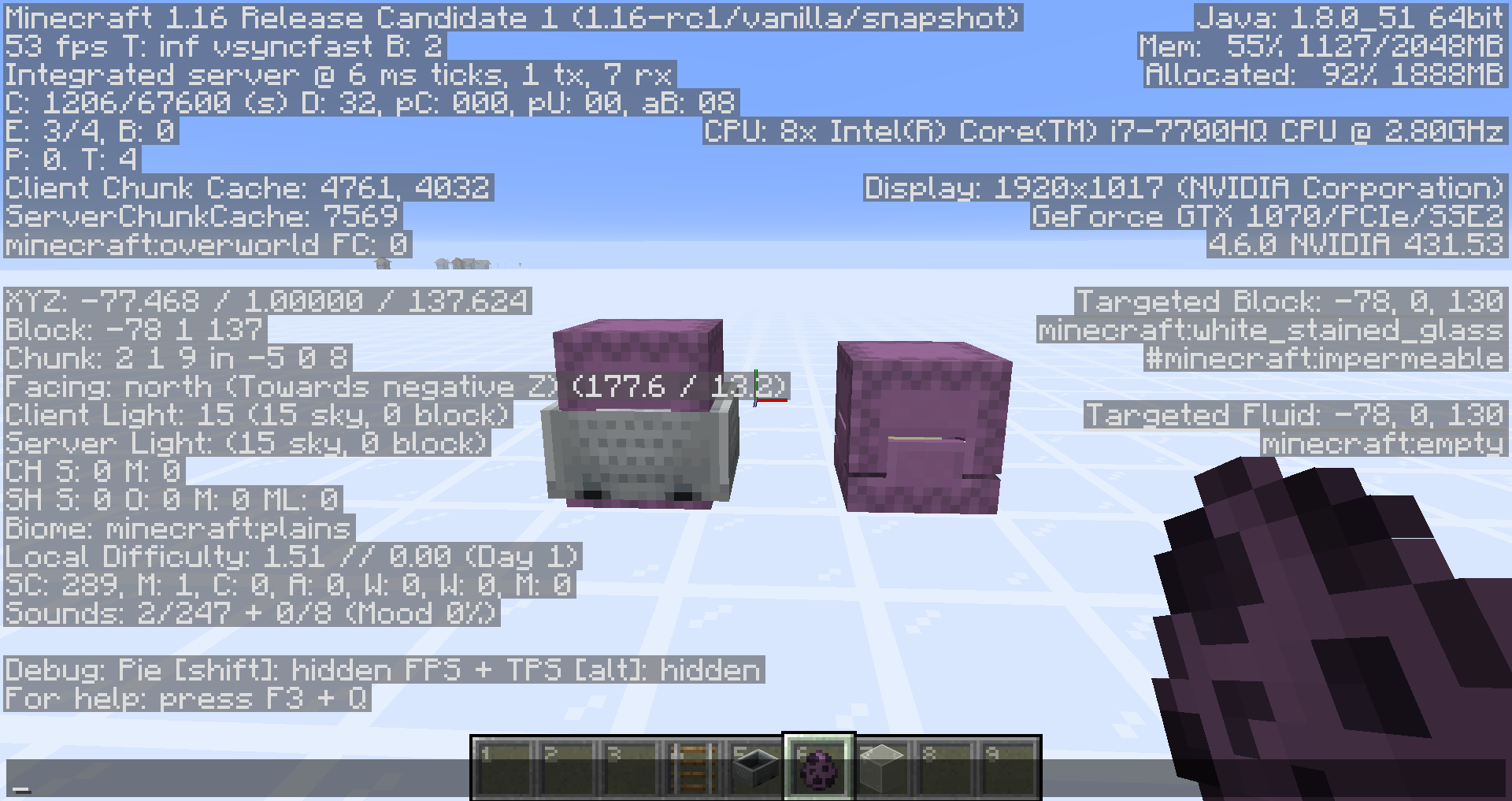 Shulkers normally are the only remaining option for mob switches (Mojang, please do not remove 😞), as they don't despawn but count toward the mob cap. In order to make my mobswitch look nice and not have shulkers teleport everywhere, I put them in a minecart to also easily swap them between chunk borders. On my realm, my updating to 1.16 will break not only my farms but the mobswitch that would let me repair them without being flooded with items. This screenshot shows a singleplayer world with two shulkers in a glass flat world I just emptied of entities, one in a minecart and one not. Both were spawned with a spawn egg, no commands other than to kill everything. The new mob cap display shows not 2 for monsters, but 1. The other screenshot is my mobswitch, and I can't prove that it works with the f3 screen, but there are no hostiles when the light is on, and when it is off mobs can spawn when you are far enough away.