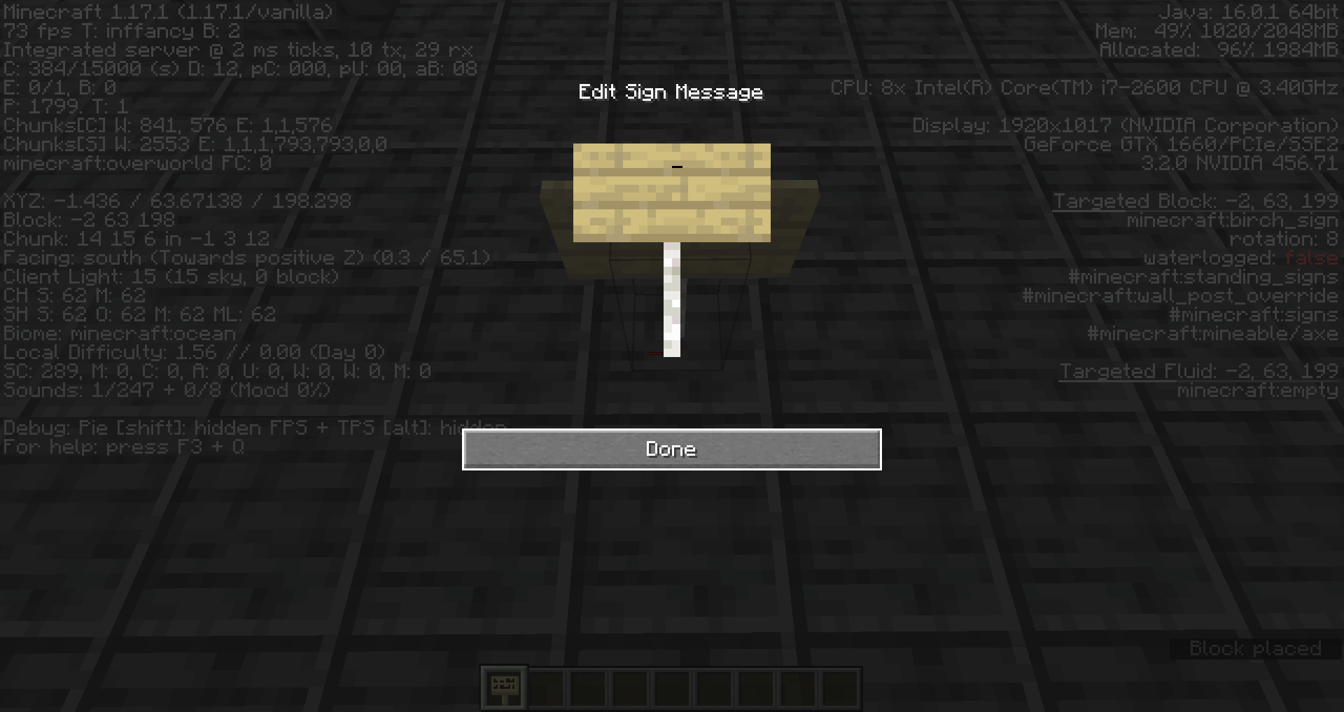 When in the sign editing interface, if I press tab while I'm editing the sign, the "Done" button gets focus, as expected. However, there is no way to move focus away from the button. Pressing tab (or shift+tab) again doesn't work, nor does clicking the mouse elsewhere. I can use the mouse to put the cursor back on the sign, and continue editing it, but as soon as I press space, the UI closes since the button still has focus.