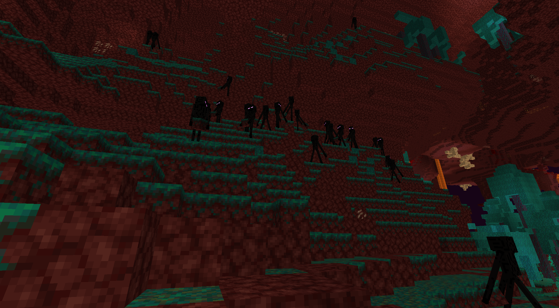 in my survival world i have used commands to locate a warped forest and clicking the coordinates to teleport there was an area with fifteen to twenty enderman standing in a general area upon 5 minutes of being there i'm not sure if the teleporting had anything to do with it but it seemed they were spawning on one block
