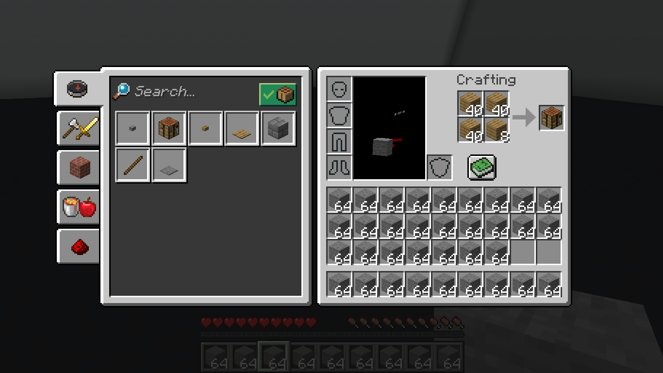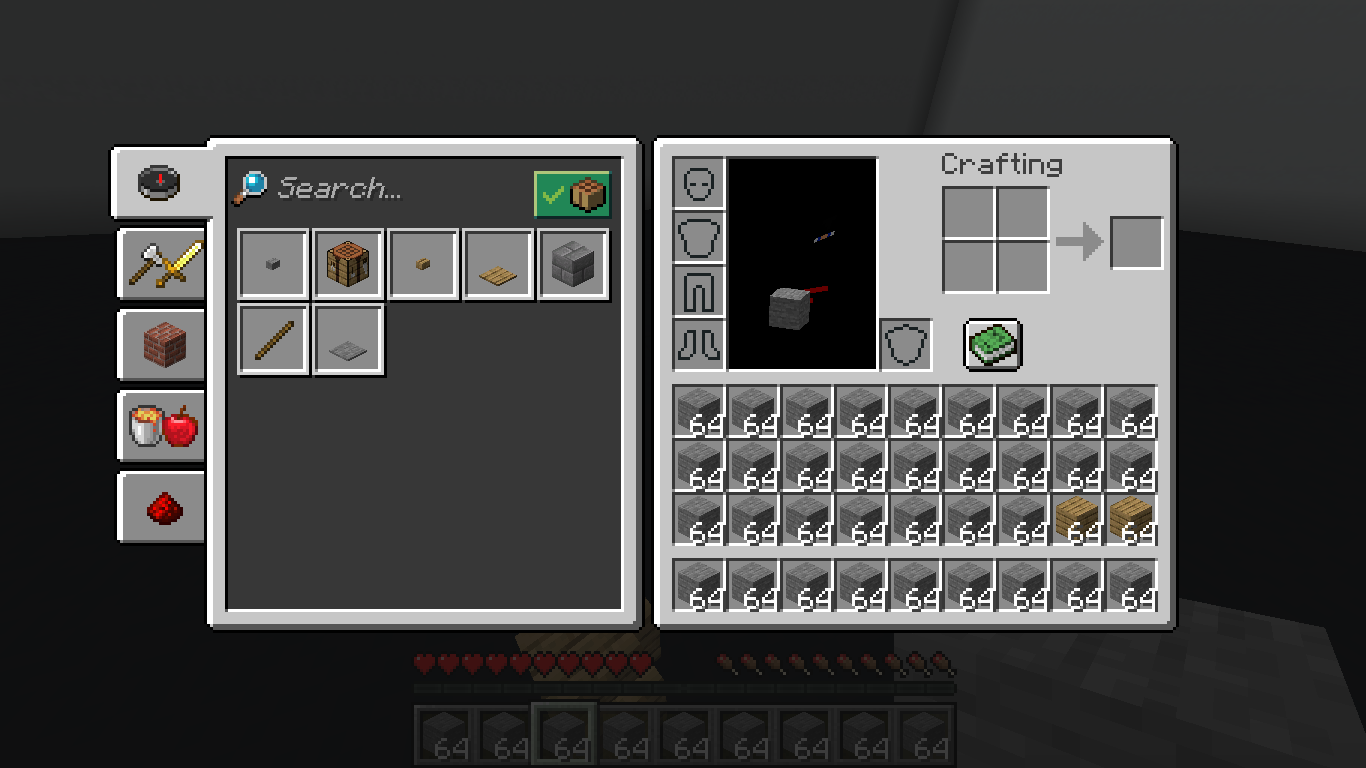 5. Open the player inventory. Have it so the Crafting Book/Guide is active and showing available crafting recipes (e.g. "Stone Button", "Crafting Table", "Oak Button", etc...).