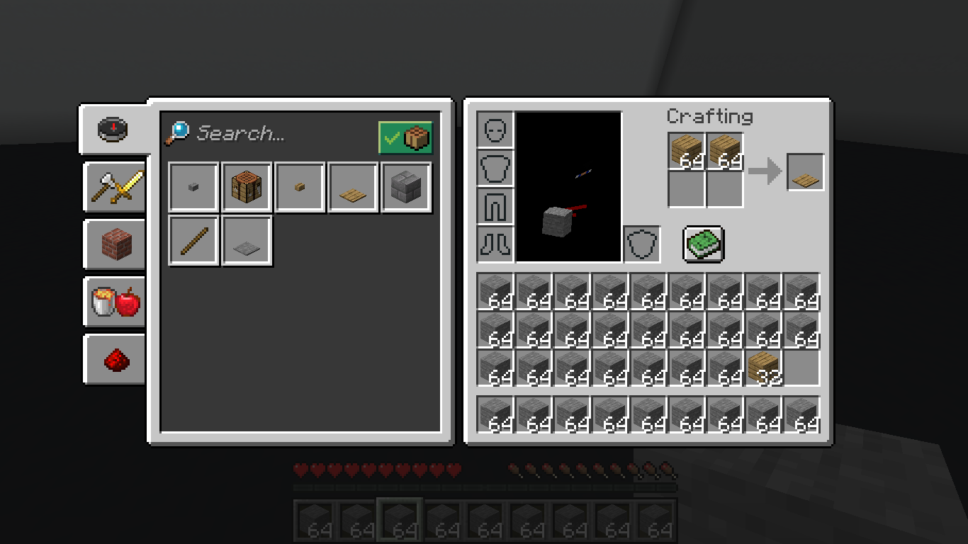 2. At this point, you should have two stacks of "Oak Planks" in the inventory, and 32 x "Oak Planks" sitting below the player.