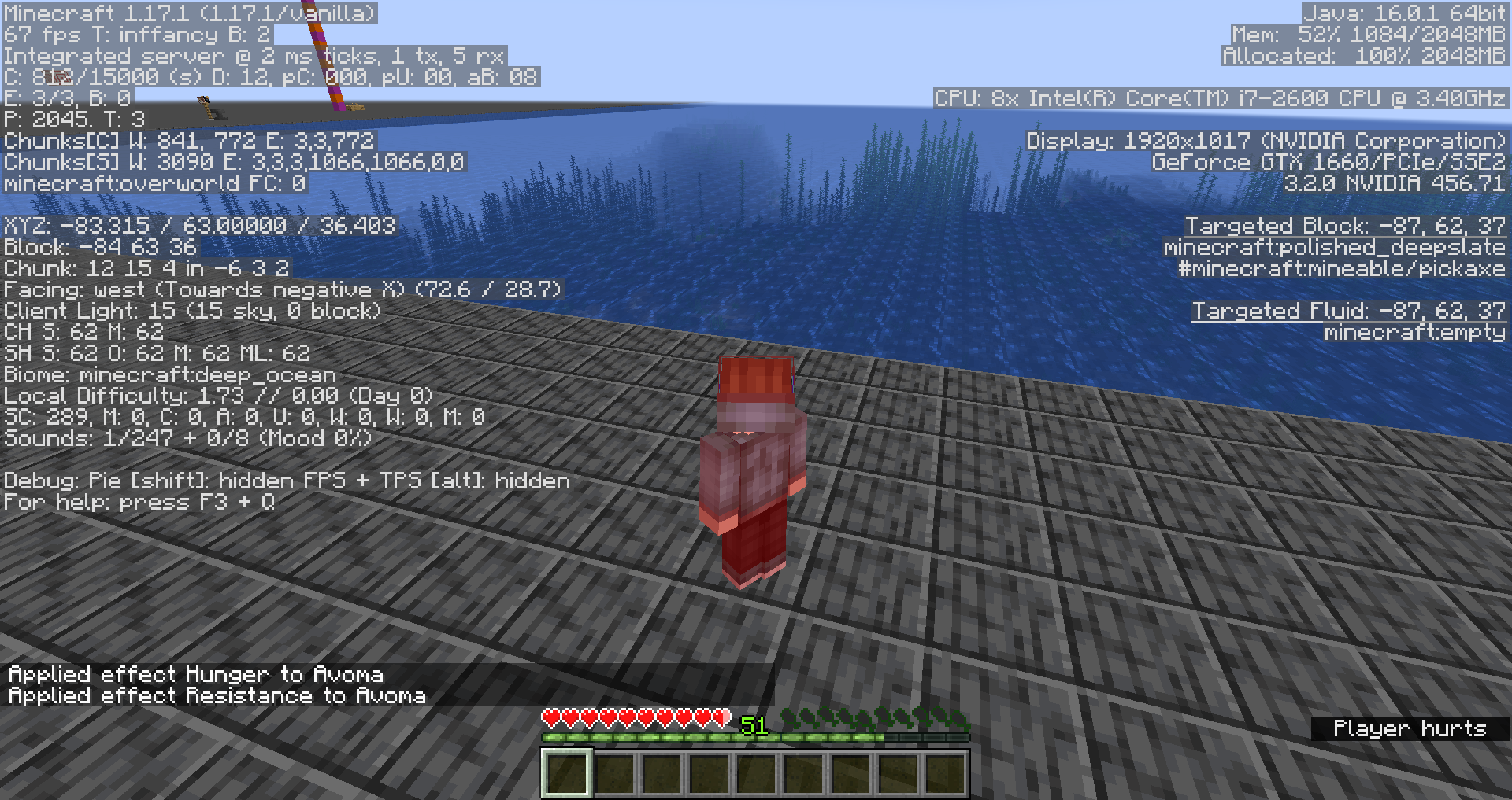 Switch into survival mode and give yourself both the hunger and resistance effects by using the commands provided below.