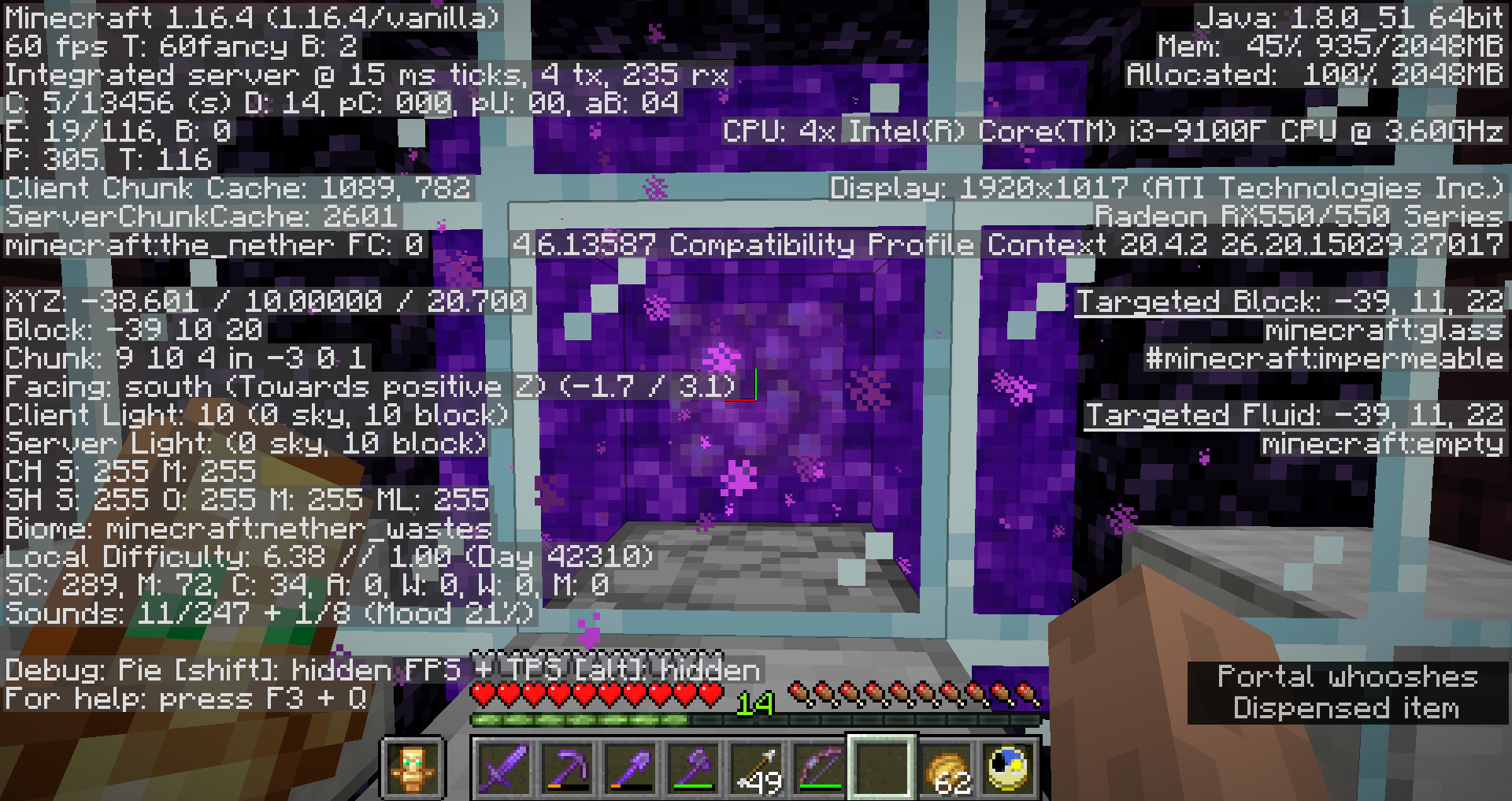 Make sure all four nether portals in the test world are lit before starting. Two portals are for the player, two are for the items.