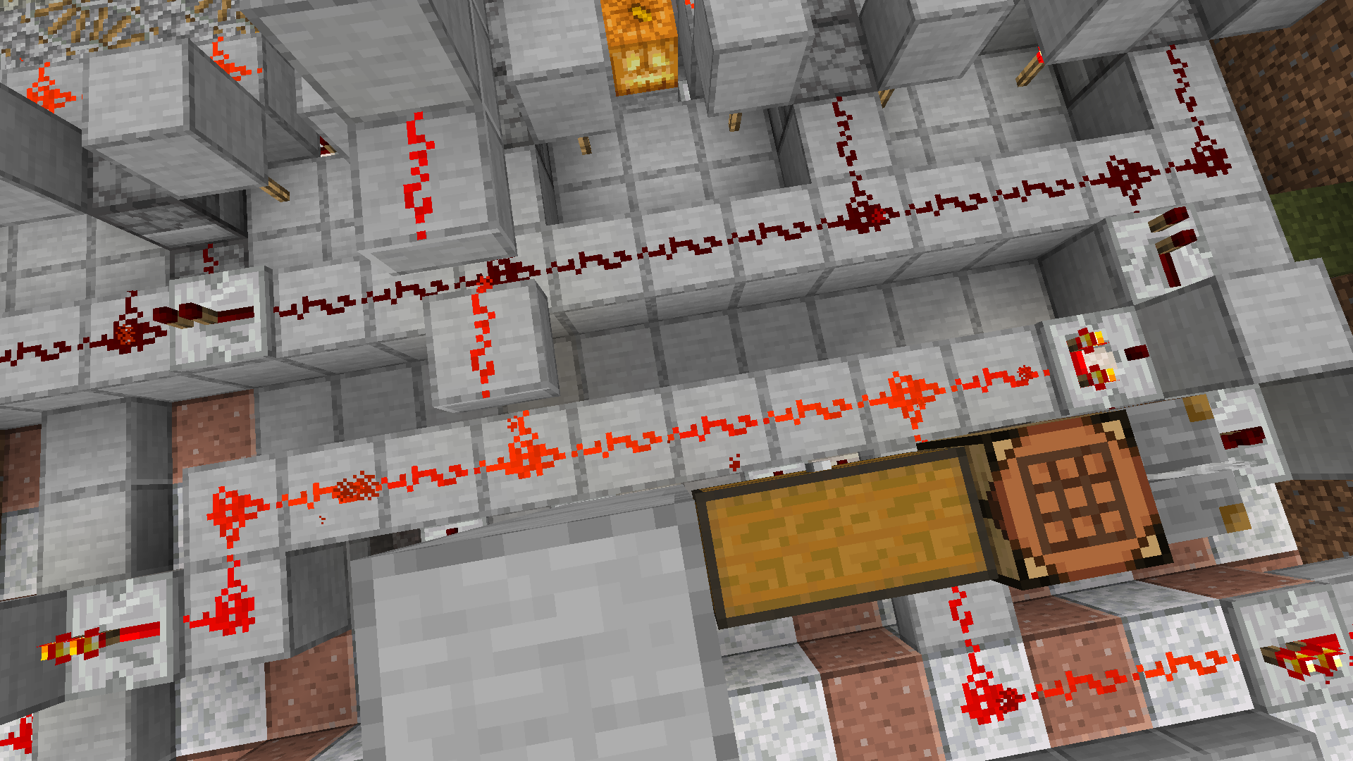 My droppers aren't working. I'm standing on a repeater. If I replace this repeater with a redstone dust, 3 droppers will work, but the other 2 still won't. If I move this repeater 1 block to the east (left in the screenshot), 3 droppers will work but the other 2 won't. There is apparently no simple way to get all 5 droppers working. (I'm absolutely sure that this is a redstone glitch because the droppers do work if I trigger them manually with a lever next to the line of redstone dust.)