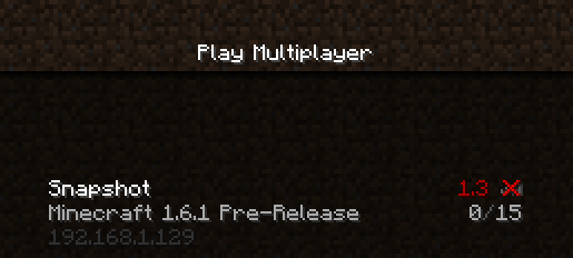 Minecraft server running 1.6.1 Pre-Release shows in older clients to be version 1.3, and unavailable, except in client version 1.3. There, it shows as available, but when trying to connect, it says outdated client.