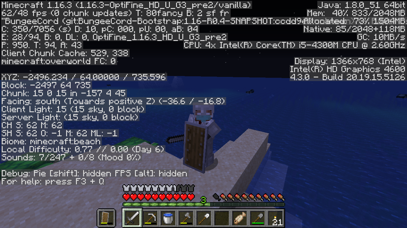 Hi, can you please take a screen capture while connected to the server before the crash occurs? Make sure the F3 debug screen is on and attach the image to this report. Thanks