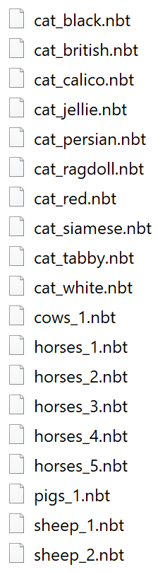 The folder data/structures/village/common/animals contains a structure file for each of the eleven cat variants, except for "tuxedo".