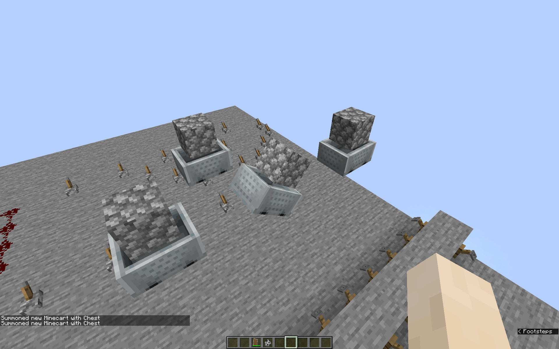 /summon minecraft:chest_minecart ~5 ~ ~ {NoGravity:1b,Invulnerable:1b,CustomDisplayTile:1b,DisplayOffset:16,Rotation:[180F,50F],OnGround:0b,DisplayState:{Name:"minecraft:cobblestone"}}/summon minecraft:chest_minecart ~5 ~ ~ {NoGravity:1b,Invulnerable:1b,CustomDisplayTile:1b,DisplayOffset:16,Rotation:[180F,50F],OnGround:0b,DisplayState:{Name:"minecraft:cobblestone"}}Replicate