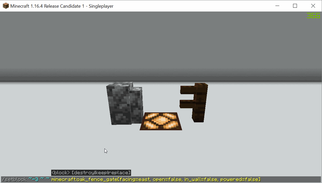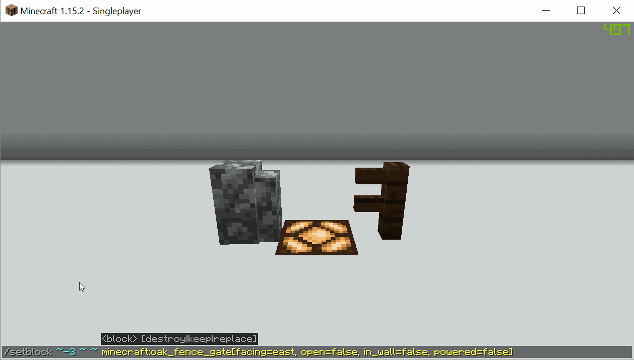 Command used in example - "/setblock ~-3 ~ ~ minecraft:oak_fence_gate[facing=east, open=false, in_wall=false, powered=false]"