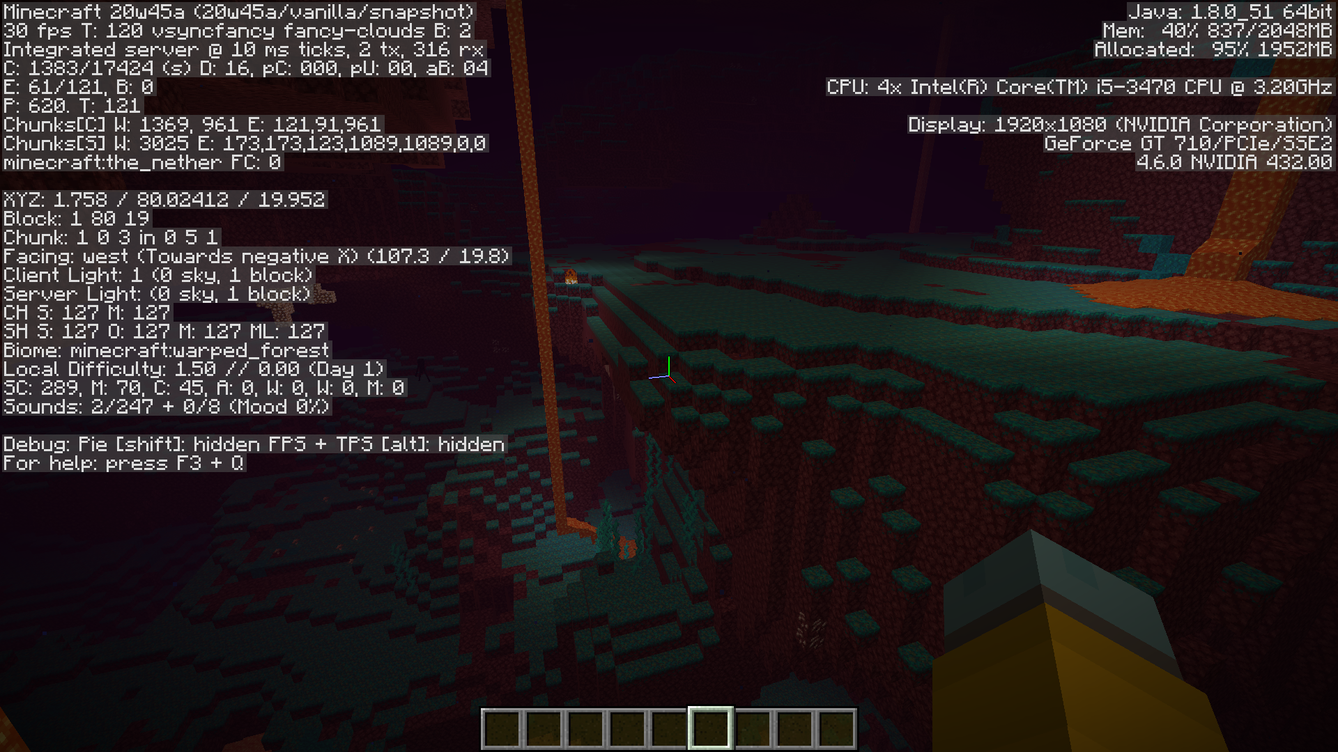 When I stepped into the nether I expected to see the warped forest, but instead I found what could be best described as warped plains, as I found no trees in the cyan encrusted area.