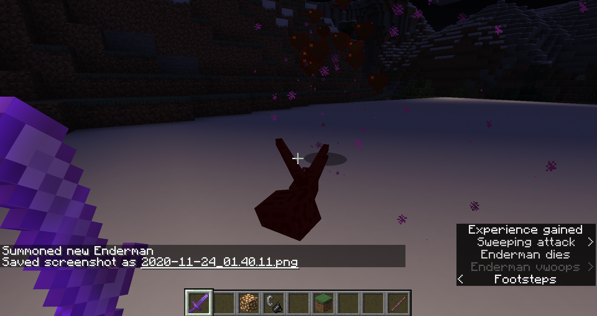 /summon minecraft:enderman ~ ~ ~ {carriedBlockState:{Name:water}}/summon minecraft:enderman ~ ~ ~ {carriedBlockState:{Name:water}}Kill it and note nothing drops