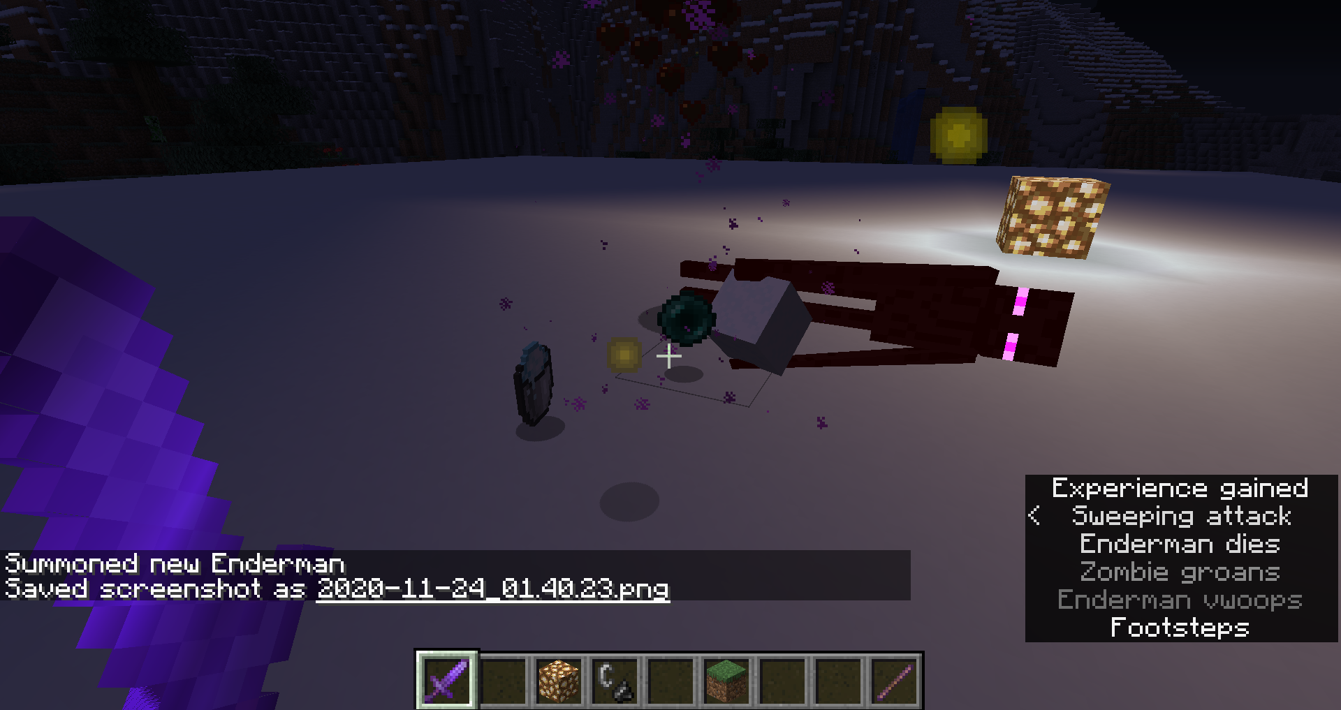 /summon minecraft:enderman ~ ~ ~ {carriedBlockState:{Name:powder_snow}}/summon minecraft:enderman ~ ~ ~ {carriedBlockState:{Name:powder_snow}}Kill it and note the dropped powder snow bucket