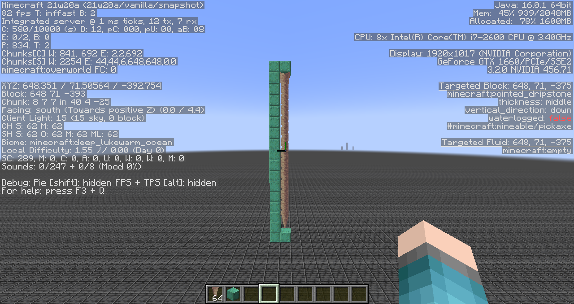 When the block above a stalactite is broken, the stalactite will fall downwards. However, if there is a block directly below the end of the stalactite, the rest of the stalactite doesn't fall down, instead breaking immediately. This is inconsistent with the normal falling behavior of the stalactites