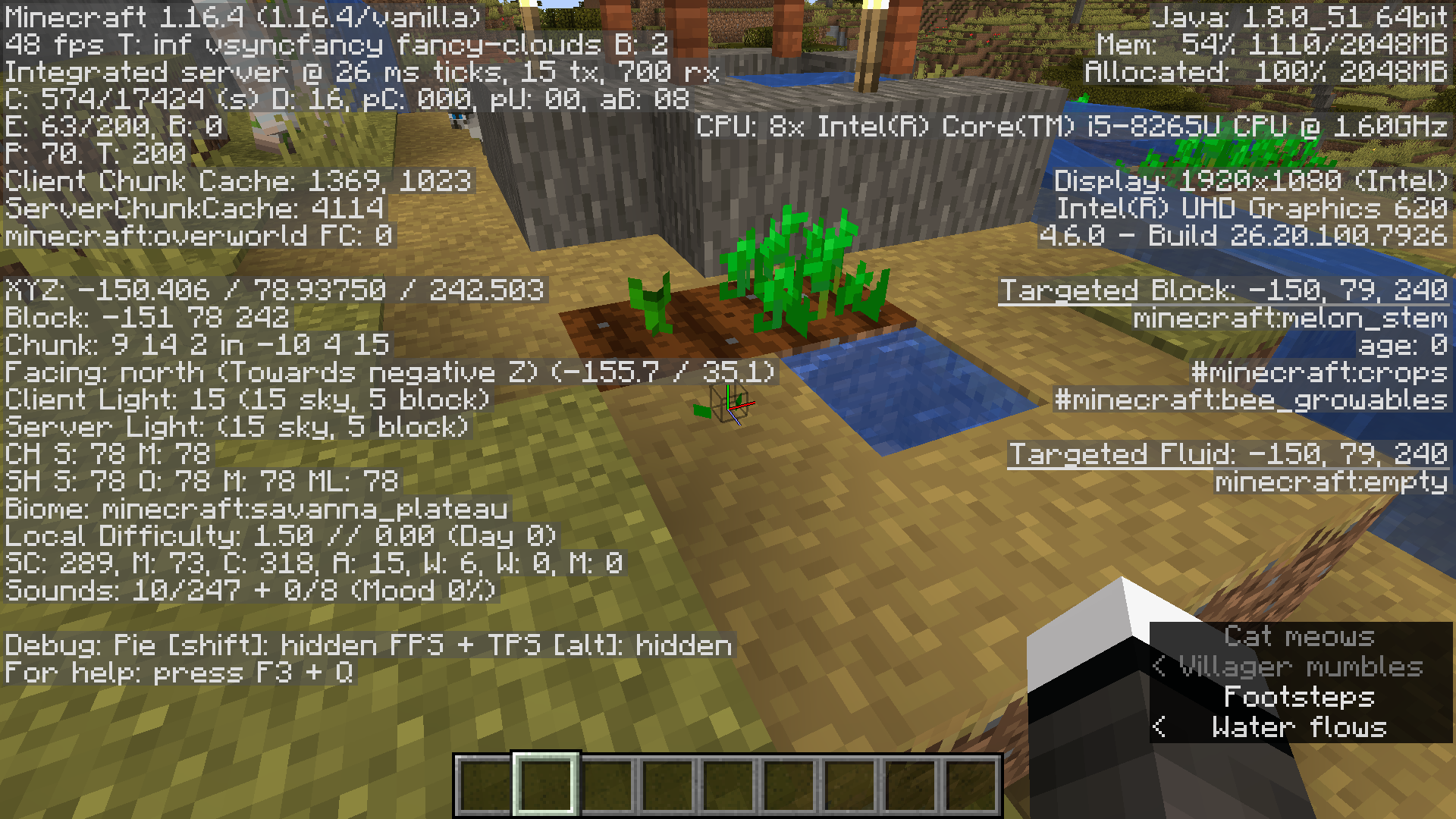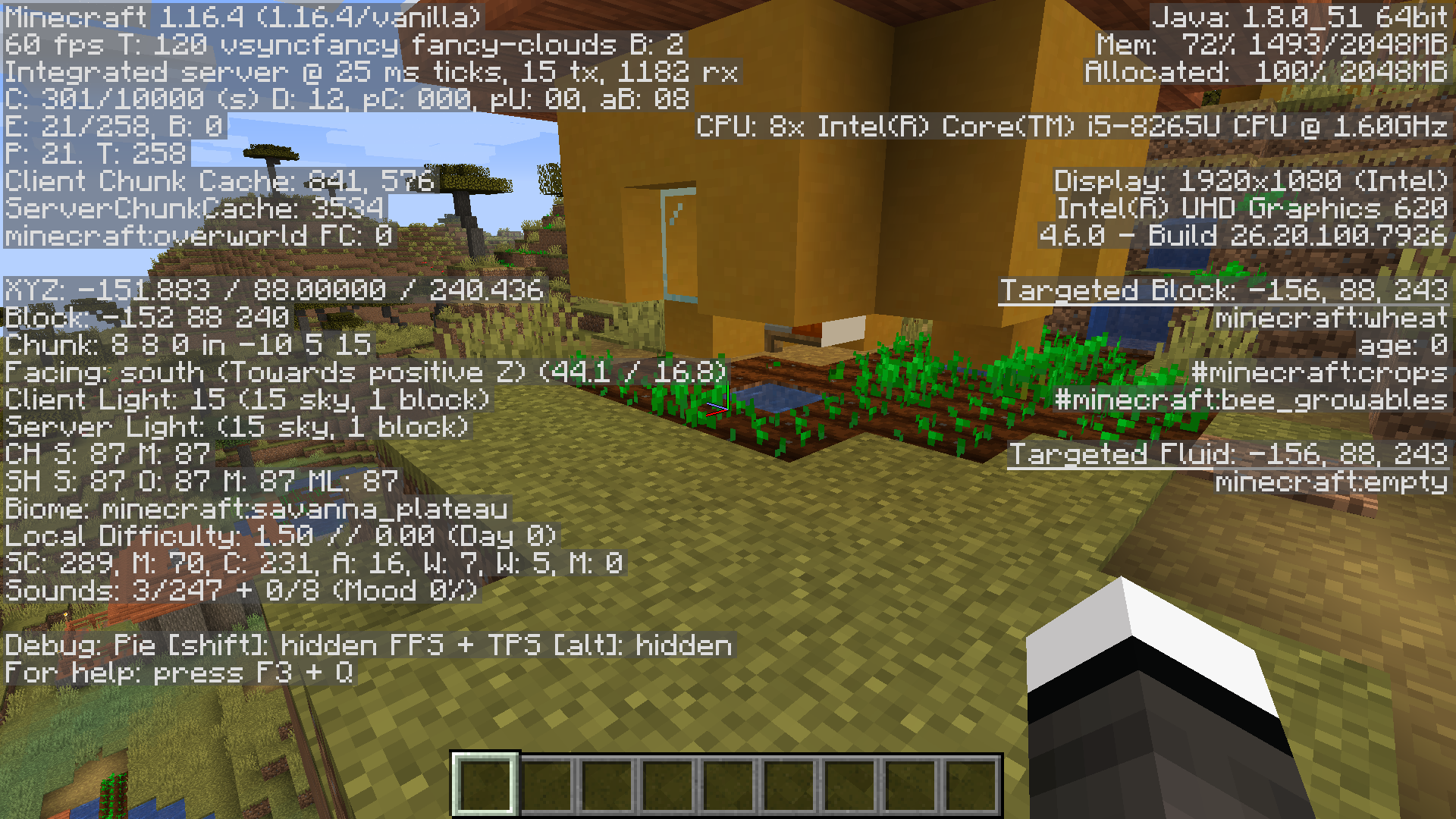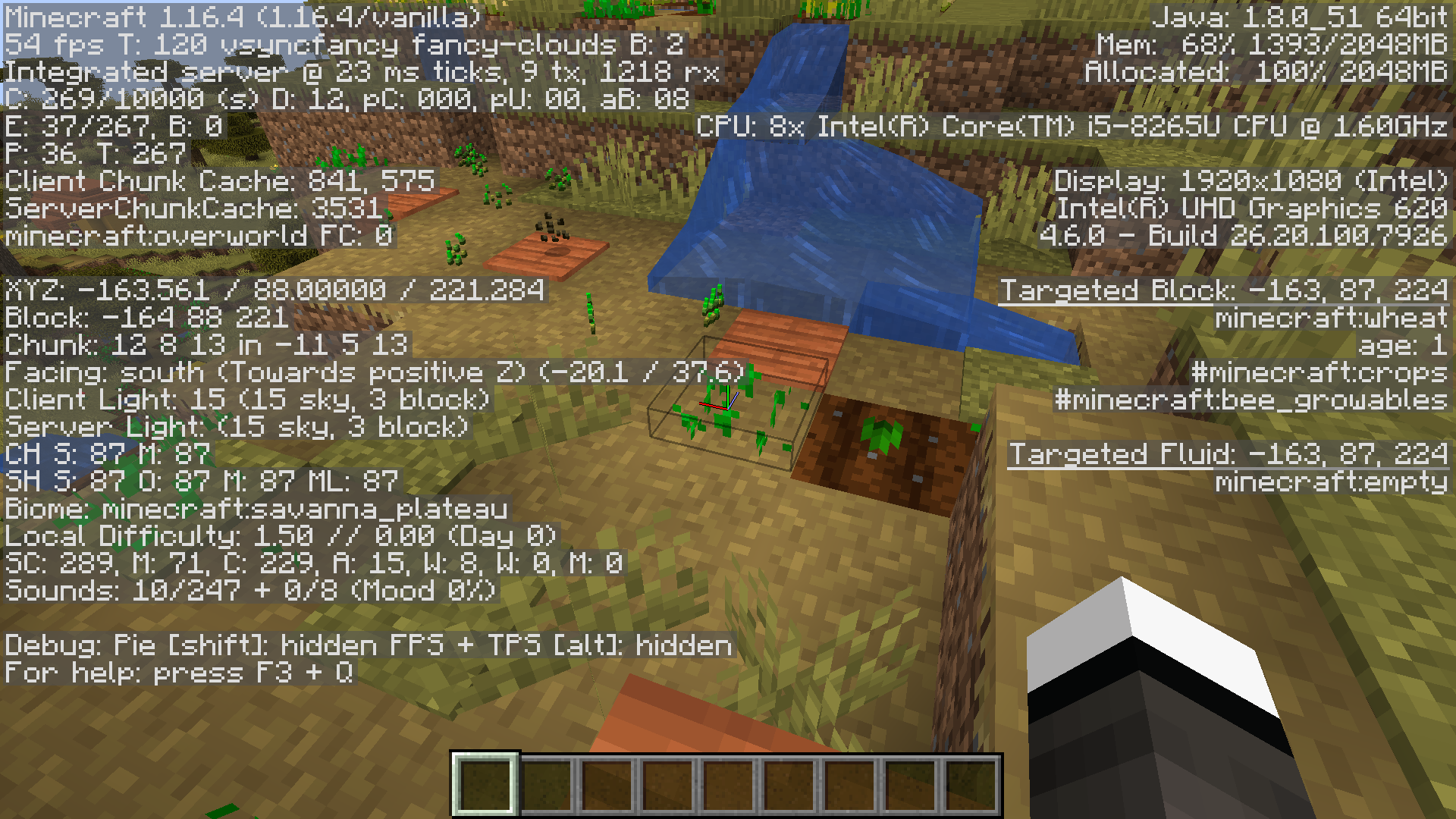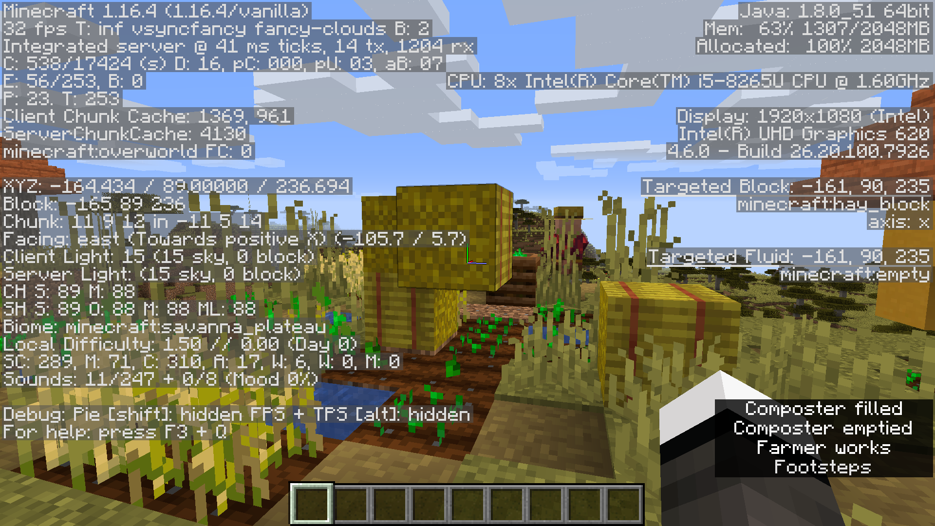 After creating a new creative world (generated structures ON) I noticed a village with a strange generation. Some elements were in wrong place: grass growing on acacia planks and stripped logs, wheat and melons growing on paths, missing acacia wood from the village well, the well ceiling moved one block from its position, the water that hydrates crops remaining still in its place without flowing away and a house where the bottom block was replaced by wheat growing on farmland and water. In this house the door was also missing the bottom part and the bed was made only of the head. I don't know if the following are bugs: farms placed on hillsides, hay bales placed on top of growing wheat and houses in biome minecraft:river. I attached some screenshot and a manual crash report that may be useful.