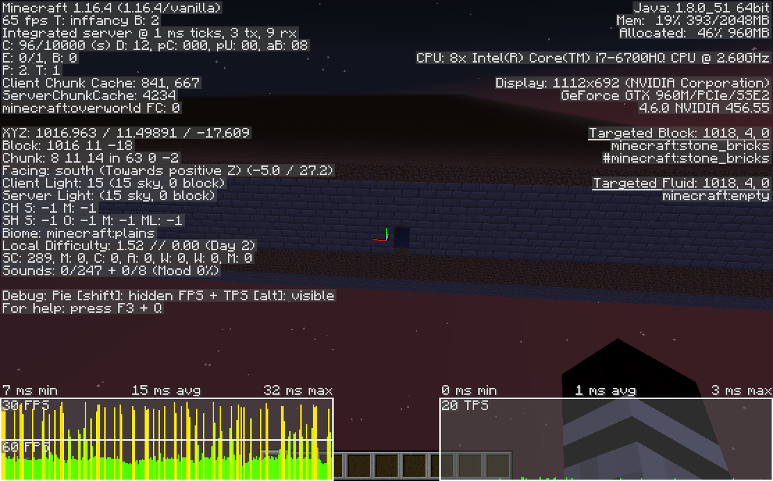 The other test, was a tiny bit less laggy. Here I covered the entire field with blocks and ontop put a few more layers of blocks. I made a hole to expose the crops to see how the FPS behaves.