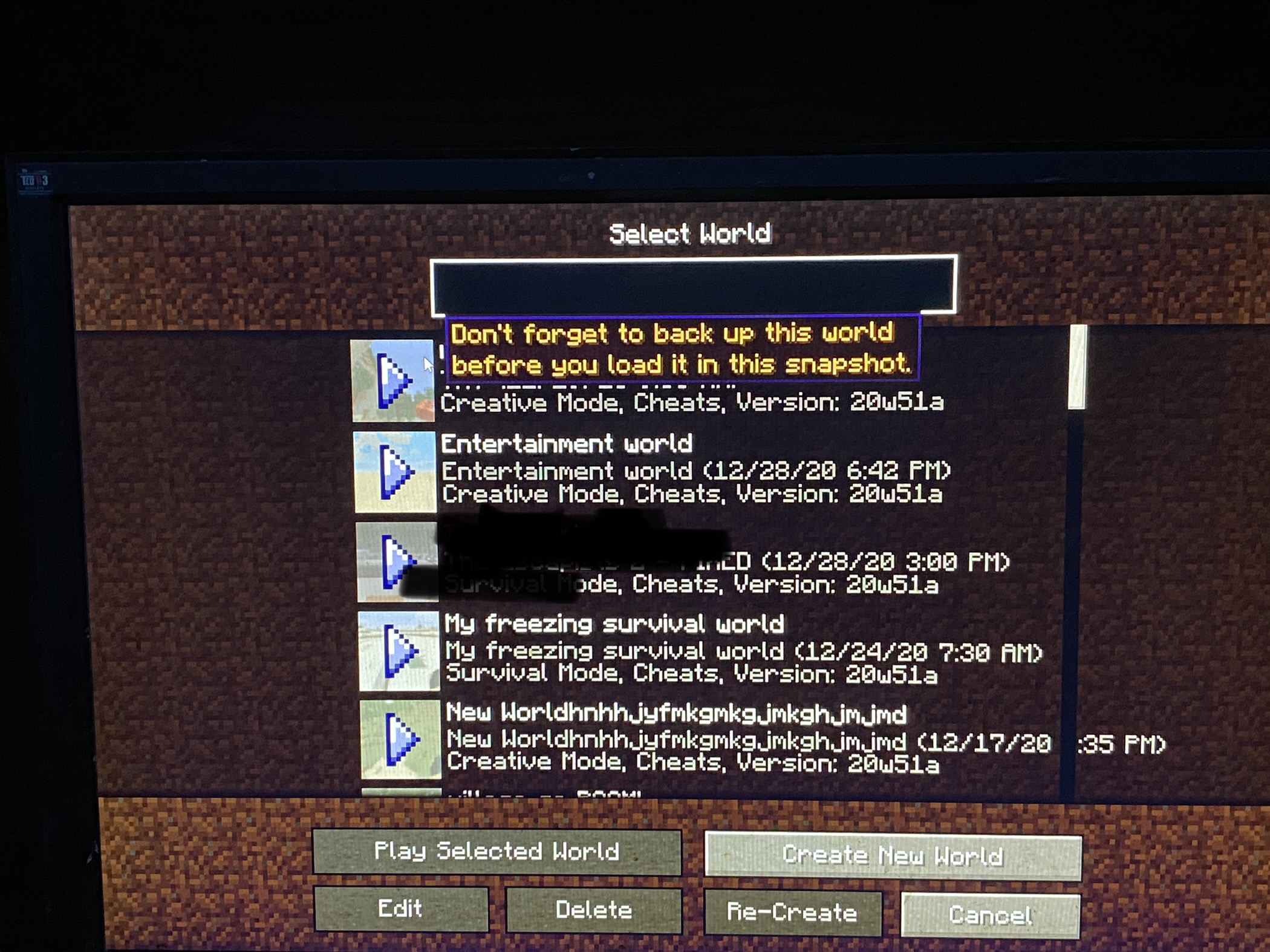 Thank you very much! Can you explain why there was a warning telling me to backup a world whenever I hover over a world that was already loaded in 20W51A? I wonder how that had to do with touchscreen mode being on. Also, that warning disappeared when I turned touchscreen mode off.