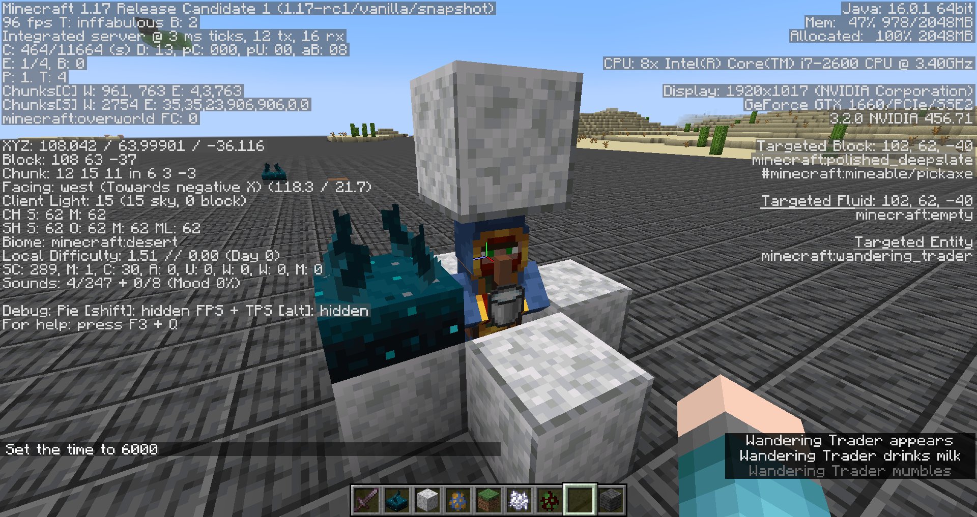 → ✔ Notice how when the wandering trader drinks the invisibility potion, the sculk sensor activates as it should.