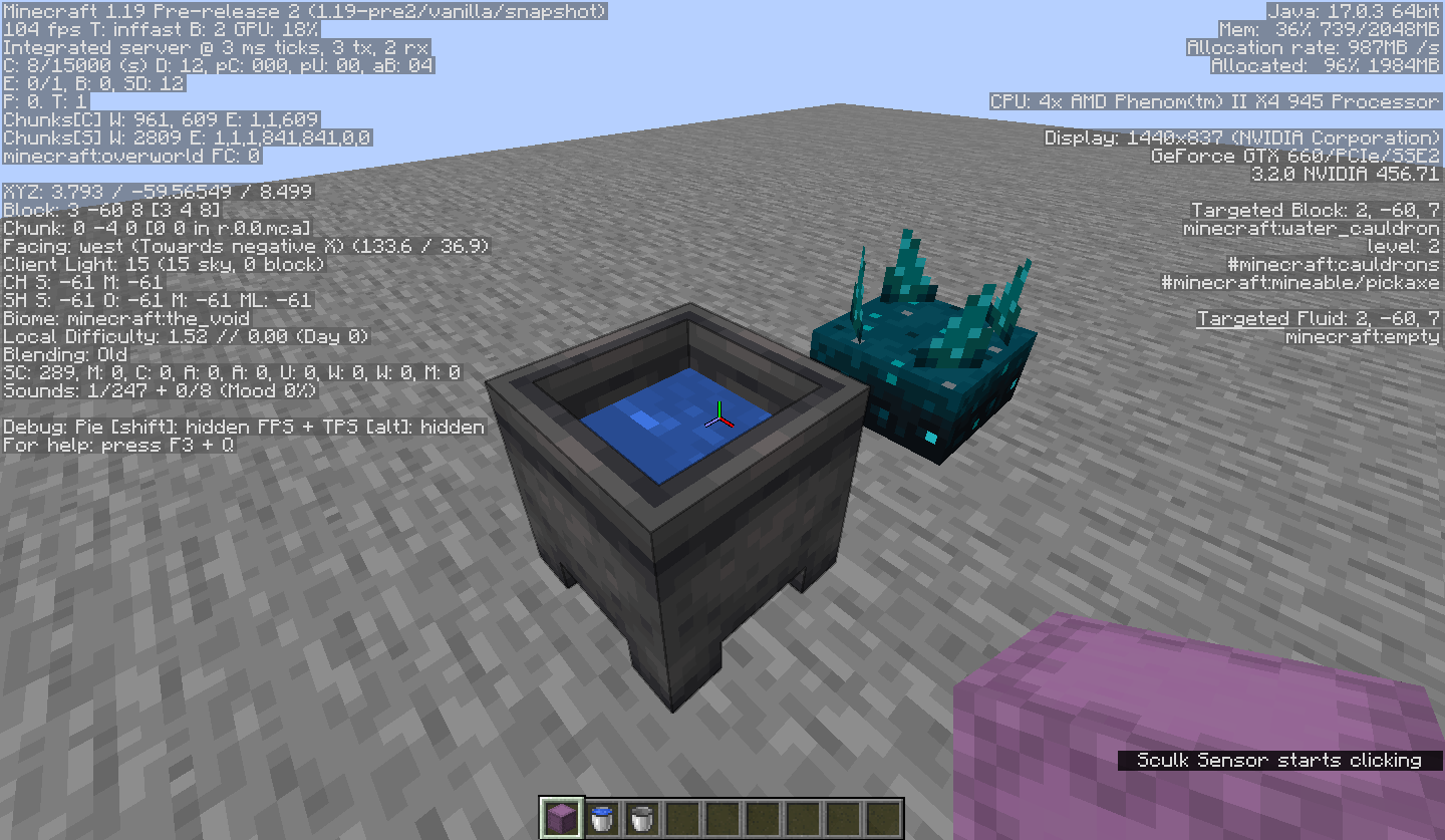 Take note as to whether or not sculk sensors are activated upon cleaning items in water cauldrons.