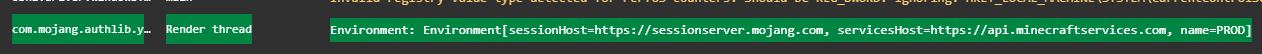 [TIME] [Render thread/INFO]: Environment: authHost='https://authserver.mojang.com', accountsHost='https://api.mojang.com', sessionHost='https://sessionserver.mojang.com', servicesHost='https://api.minecraftservices.com', name='PROD'