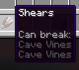 /give @s minecraft:shears{CanDestroy:["minecraft:cave_vines_head","minecraft:cave_vines_body"]}/give @s minecraft:shears{CanDestroy:["minecraft:cave_vines_head","minecraft:cave_vines_body"]}Notice how both types of cave vines blocks share the same name.