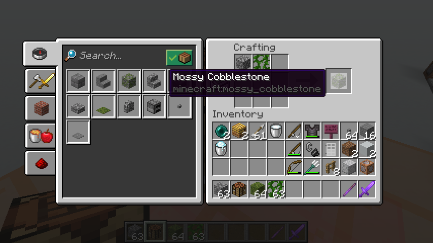 This probably falls under feature request, but I agree it would make sense for the mossy blocks to incorporate moss into their crafting recipes. Maybe 2 moss blocks and 2 cobblestone in a square pattern make 2 mossy cobblestone for example?