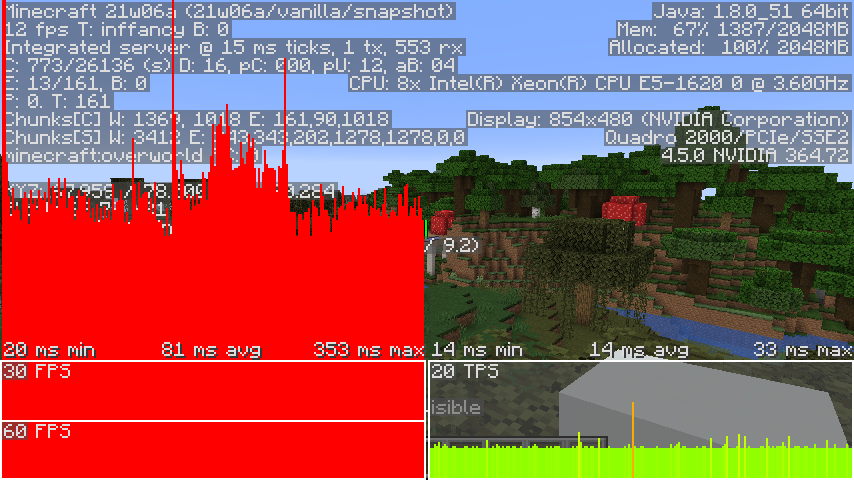 It is hard to see in the 21w06a one, but there is a lag spike in the middle there. 21w06a has very bad performance on my computer to begin with, so I've provided some screenshots from other versions as well to show where it is a little more obvious.