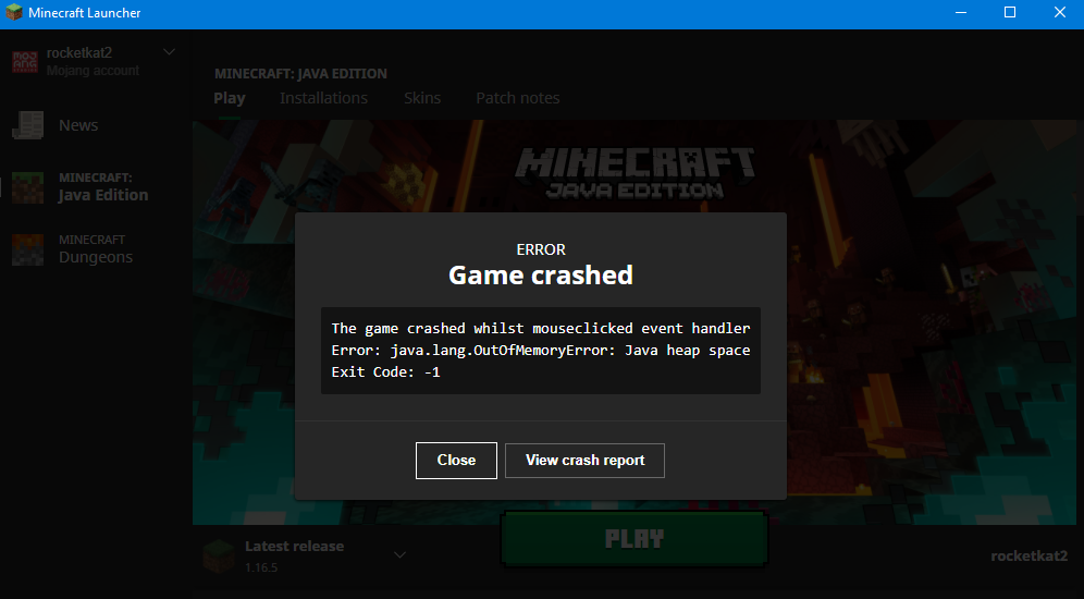 come on the minecraft launcher The game crashed whilst mouseclicked event handler