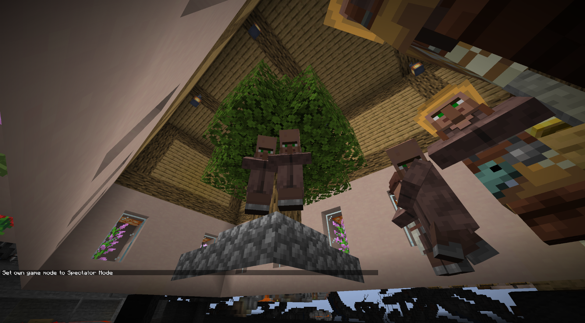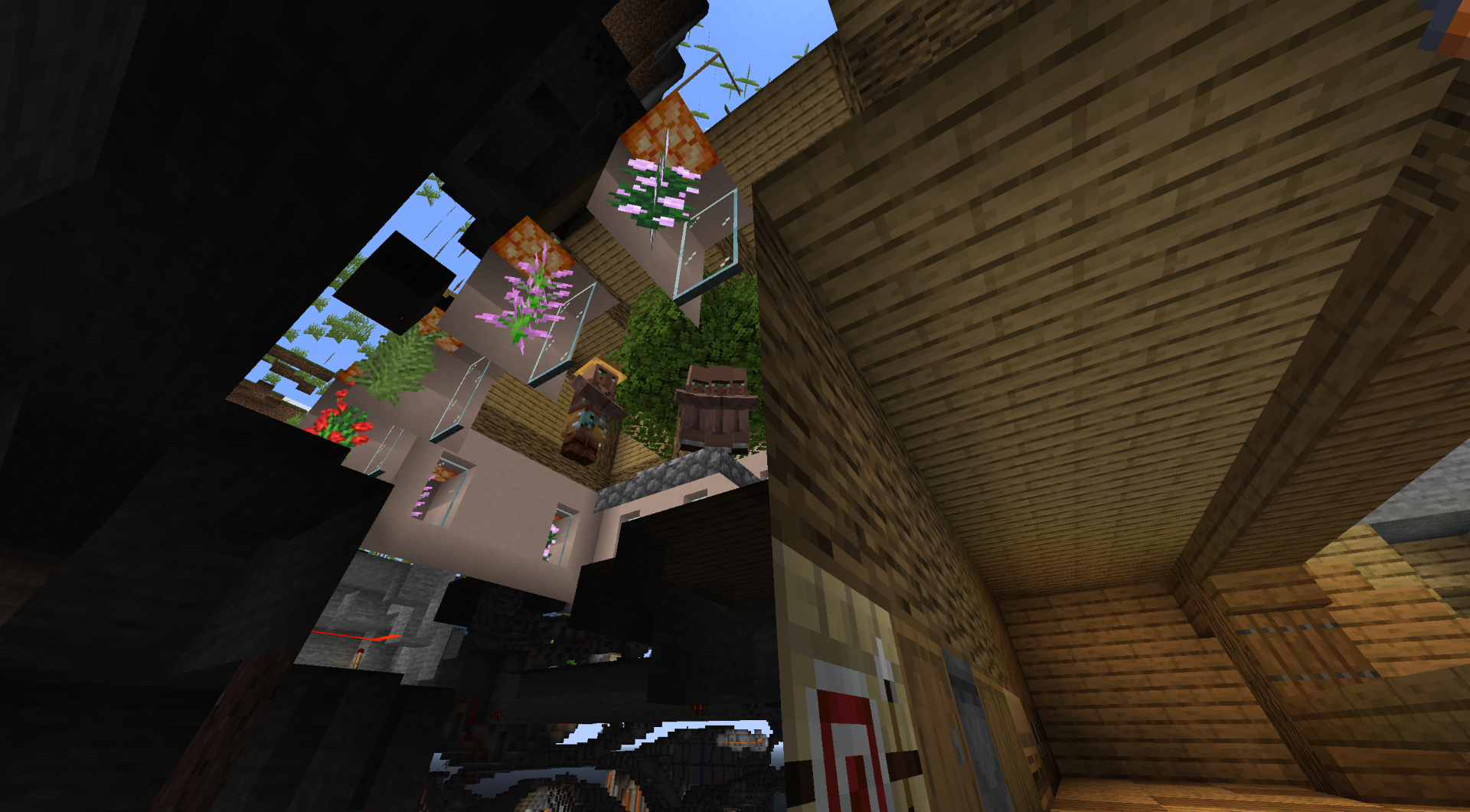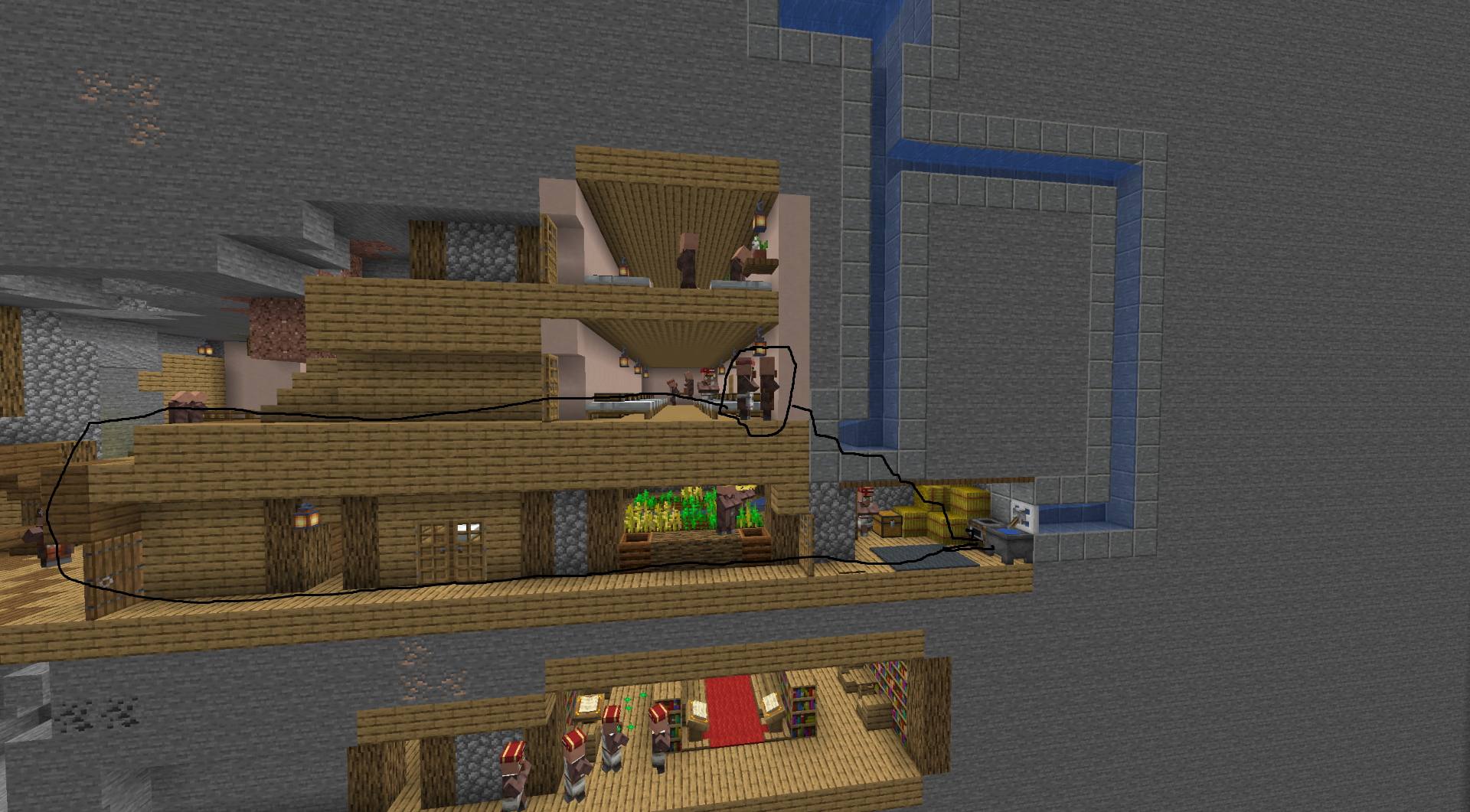 The first image below is about how a villager (The one in the center of the image, looking at the fletching table) would prefer to walk threw a fence and stand on top of a celling rather then go threw a gap to get to their work station.